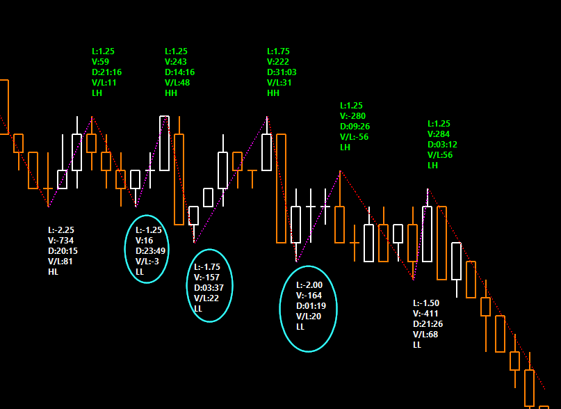 Add the Spreadsheet System/Alert study, give it a name in the Spreadsheet Name field. On the spreadsheet, enter these formulas: Cell O3: =IF(ID1.SG3@3>0,ID1.SG5@3,O4) Cell P3: =IF(ID1.SG3@3>0,O4,P4) Cell Q3: =IF(ID1.SG3@3>0,P4,Q4) -where ID1 is the Zigzag study; edit as needed. Row 3 is the current bar, so cell O3 will contain the most recent ZZ accumulate volume. Cell P3 will contain the second most recent ZZ accumulate volume. Cell Q3 will contain the third most recent ZZ accumulate volume. You can use additional Formula Columns to continue this daisy chain reference for additional previous values. Now, use formulas in K3 to N3 for your alert conditions, referencing cells O3, P3, Q3. If you only want the Lows, you could use every other column's value. Or you could use a more detailed formula referencing SG2 for only the LL and/or HL: LH = 1 HH = 2 HL = 3 LL = 4 |