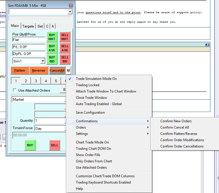 Yes post #4 answers the question. you need to disable the confirmations through the Trade Window for the chart. Refer to this image: https://www.sierrachart.com/images/TradeWindowConfirmationsStep2.png Sierra Chart Support - Engineering Level Your definitive source for support. Other responses are from users. Try to keep your questions brief and to the point. Be aware of support policy: https://www.sierrachart.com/index.php?l=PostingInformation.php#GeneralInformation For the most reliable, advanced, and zero cost futures order routing, *change* to the Teton service: Sierra Chart Teton Futures Order Routing |