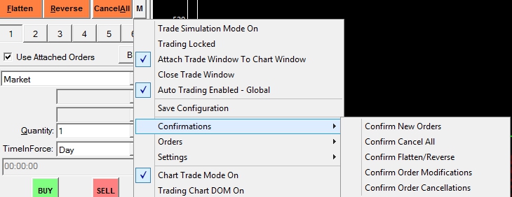 First for the record, there are no confirmations for automated trading. This is not possible. To disable confirmations on the Trade Window for manually entered orders, refer to: Basic Trading and the Trade Window: Main/C >> Menu >> Order Confirmations (chart specific) Sierra Chart Support - Engineering Level Your definitive source for support. Other responses are from users. Try to keep your questions brief and to the point. Be aware of support policy: https://www.sierrachart.com/index.php?l=PostingInformation.php#GeneralInformation For the most reliable, advanced, and zero cost futures order routing, *change* to the Teton service: Sierra Chart Teton Futures Order Routing |