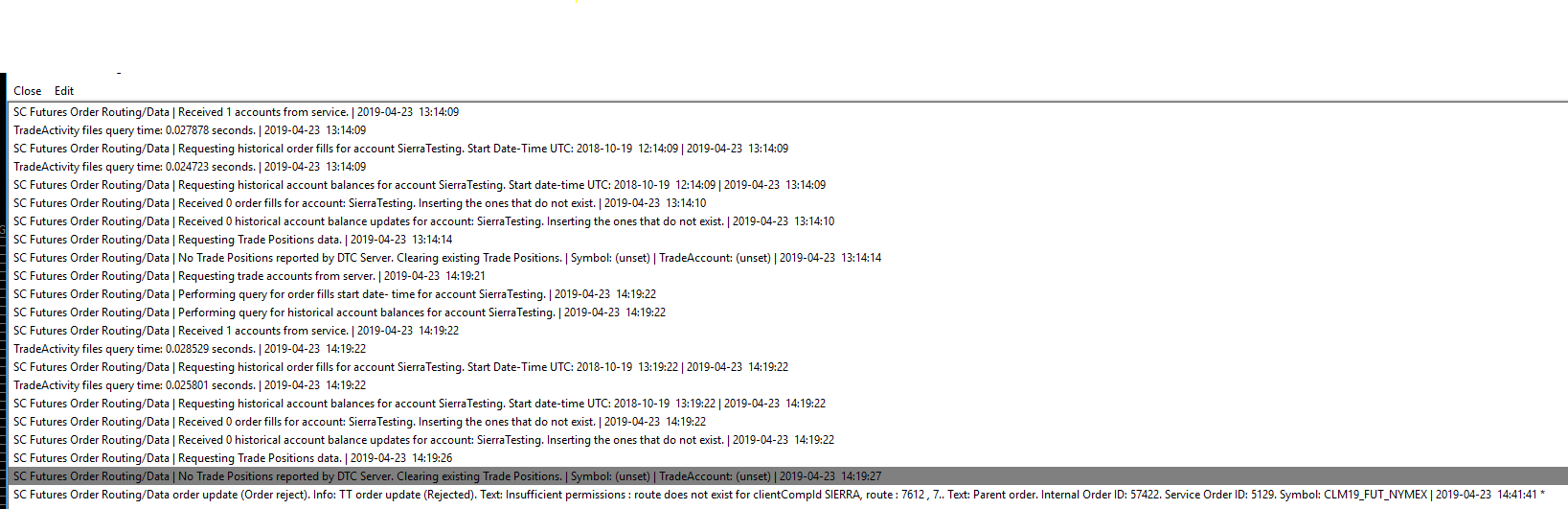 Hi SC I changed the servers to 2 and 4 respectively and these are the trade service log messages: TradeActivity files query time: 0.032856 seconds. | 2019-04-25 06:24:26 TradeActivity files query time: 0.017873 seconds. | 2019-04-25 06:24:26 SC Futures Order Routing/Data | Requesting trade accounts from server. | 2019-04-25 06:24:33 SC Futures Order Routing/Data | Performing query for order fills start date- time for account SierraTesting. | 2019-04-25 06:24:33 SC Futures Order Routing/Data | Performing query for historical account balances for account SierraTesting. | 2019-04-25 06:24:33 SC Futures Order Routing/Data | Received 1 accounts from service. | 2019-04-25 06:24:33 TradeActivity files query time: 0.036914 seconds. | 2019-04-25 06:24:33 TradeActivity files query time: 0.029079 seconds. | 2019-04-25 06:24:33 SC Futures Order Routing/Data | Requesting historical order fills for account SierraTesting. Start Date-Time UTC: 2018-10-21 05:24:33 | 2019-04-25 06:24:33 TradeActivity files query time: 0.027663 seconds. | 2019-04-25 06:24:33 SC Futures Order Routing/Data | Requesting historical account balances for account SierraTesting. Start date-time UTC: 2018-10-21 05:24:33 | 2019-04-25 06:24:33 SC Futures Order Routing/Data | Received 0 order fills for account: SierraTesting. Inserting the ones that do not exist. | 2019-04-25 06:24:33 SC Futures Order Routing/Data | Received 0 historical account balance updates for account: SierraTesting. Inserting the ones that do not exist. | 2019-04-25 06:24:33 TradeActivity files query time: 0.022739 seconds. | 2019-04-25 06:24:34 SC Futures Order Routing/Data | Requesting Trade Positions data. | 2019-04-25 06:24:38 SC Futures Order Routing/Data | No Trade Positions reported by DTC Server. Clearing existing Trade Positions. | Symbol: (unset) | TradeAccount: (unset) | 2019-04-25 06:24:38 SC Futures Order Routing/Data order update (Order reject). Info: TT order update (Rejected). Text: Insufficient permissions : route does not exist for clientCompId SIERRA, route : 7612 , 7. Internal Order ID: 57453. Service Order ID: 5151. Symbol: CLM19_FUT_NYMEX | 2019-04-25 06:24:44 * SC Futures Order Routing/Data order update (Order reject). Info: TT order update (Rejected). Text: Insufficient permissions : route does not exist for clientCompId SIERRA, route : 7612 , 7. Internal Order ID: 57454. Service Order ID: 5152. Symbol: CLM19_FUT_NYMEX | 2019-04-25 06:25:06 * SC Futures Order Routing/Data order update (Order reject). Info: TT order update (Rejected). Text: Insufficient permissions : route does not exist for clientCompId SIERRA, route : 7612 , 7. Internal Order ID: 57455. Service Order ID: 5153. Symbol: CLM19_FUT_NYMEX | 2019-04-25 06:25:11 * SC Futures Order Routing/Data order update (Order reject). Info: TT order update (Rejected). Text: Insufficient permissions : route does not exist for clientCompId SIERRA, route : 7612 , 7. Internal Order ID: 57456. Service Order ID: 5154. Symbol: CLM19_FUT_NYMEX | 2019-04-25 06:25:30 * SC Futures Order Routing/Data order update (Order reject). Info: TT order update (Rejected). Text: Insufficient permissions : route does not exist for clientCompId SIERRA, route : 7612 , 7. Internal Order ID: 57457. Service Order ID: 5155. Symbol: CLM19_FUT_NYMEX | 2019-04-25 06:25:34 * SC Futures Order Routing/Data order update (Order reject). Info: TT order update (Rejected). Text: Insufficient permissions : route does not exist for clientCompId SIERRA, route : 7612 , 7. Internal Order ID: 57458. Service Order ID: 5156. Symbol: CLM19_FUT_NYMEX | 2019-04-25 06:25:41 * Waiting for you to resolve this. |