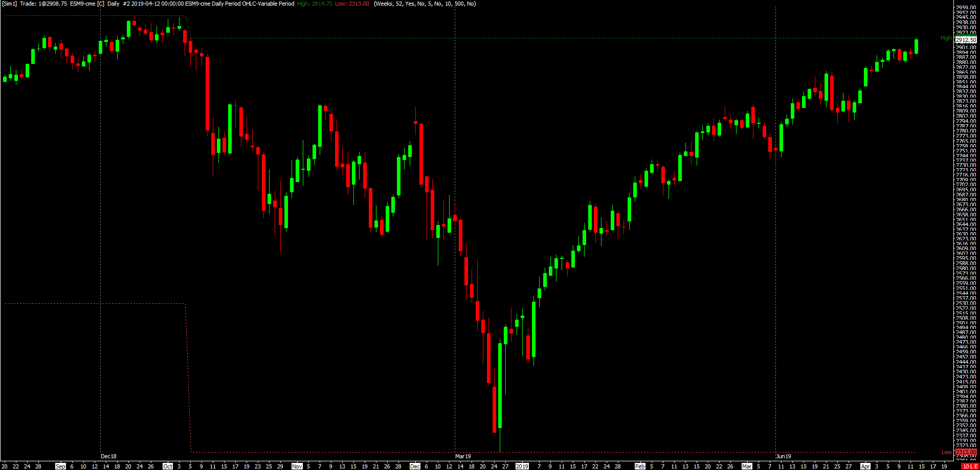 I am trying to plot 2 lines to show 52 Week H/L of ESM19 continuous contract(Date Rule Rollover) I am using the built-in 'Period OHLC-Variable Period' study I am getting wrong values for 52 week High, and may have something to do with parameters I am using If this is not the appropriate study do this please suggest any other simpler method Settings are as follows: I have hidden Open and Close values Time period Type = Weeks Time Period length = 52 Use current period = Yes Number of days to calculate = 500 The correct value is the High value for 9/21/18, but the value is the High of 4/12/19 Screen shot of the chart is attached http://www.sierrachart.com/image.php?Image=1555308970820.png |