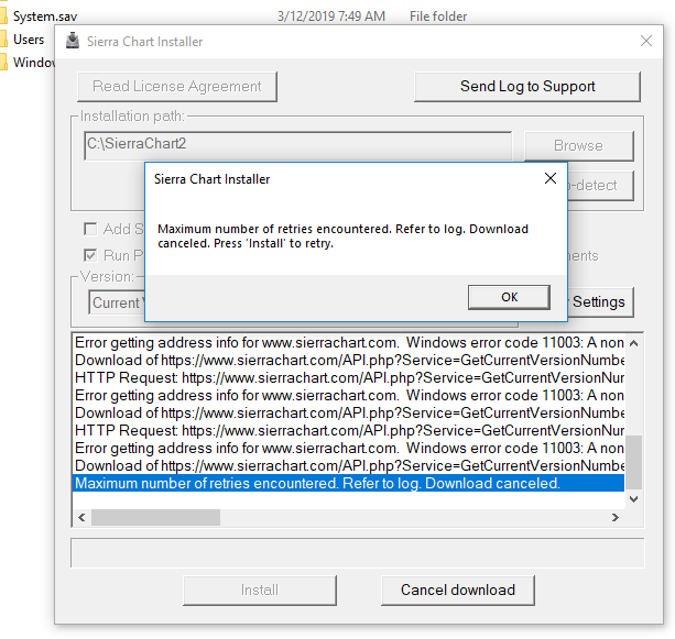 What error is the installer giving you? You can use the Zip installer if needed. Sierra Chart Support - Engineering Level Your definitive source for support. Other responses are from users. Try to keep your questions brief and to the point. Be aware of support policy: https://www.sierrachart.com/index.php?l=PostingInformation.php#GeneralInformation For the most reliable, advanced, and zero cost futures order routing, *change* to the Teton service: Sierra Chart Teton Futures Order Routing |