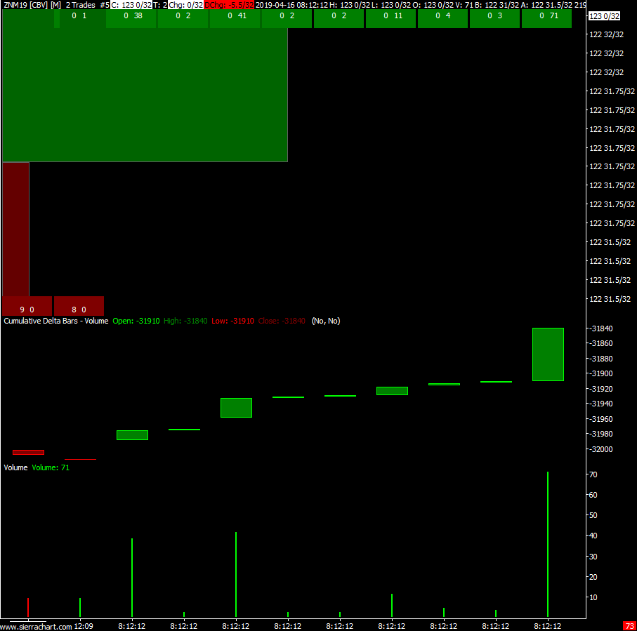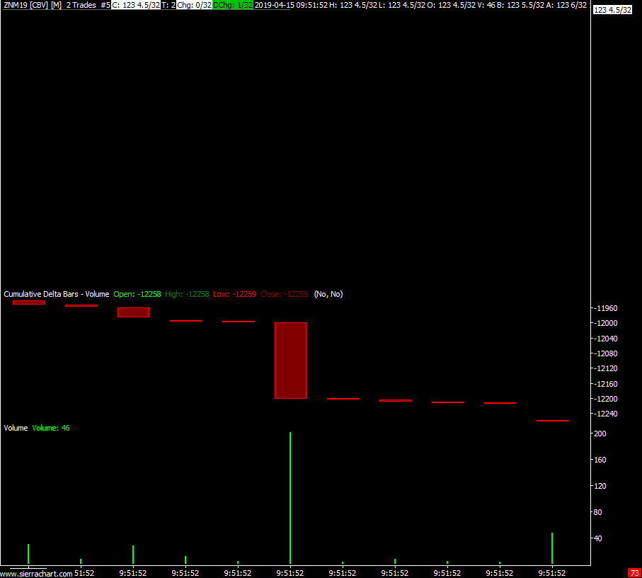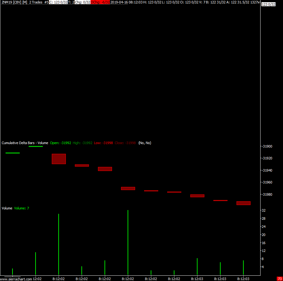 in chart settings, when i set the Bar Period Type to "trades per bar" and then set the # to something small like "2" (2 trades per bar), my NumberBars chart has lots of empty space. However, for this chart type, i should only see an entry when there is a trade (minimum volume threshold is set to zero) and that volume should show up as a cell with the volume traded at the price traded. I have added the volume study to my chart....which seems to show that volume is trading, but for portions of the chart, the Number bars section of the chart is empty? http://www.sierrachart.com/image.php?Image=1555380992322.png i'm using version 1842 32-bit I'm doing this to populate and backtest a strategy and i need tick level data (hence, trades per bar is a very small number) |
