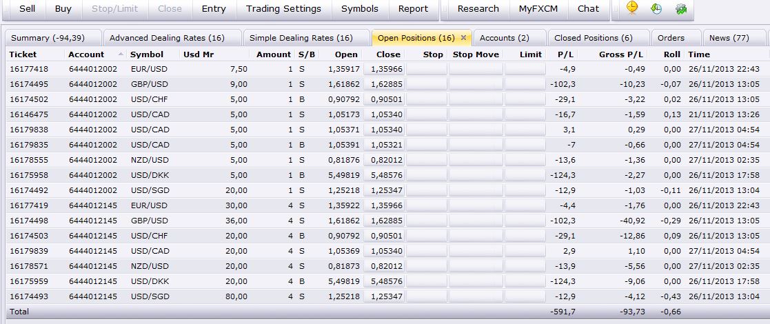 Hi, again, it can be seen here what happened a while ago.... Another example about what has been said in my previous Post in Poin 8b)... "b) Sometimes, when a Reversal should take place (during this "debugging" time, we made the Systems first to flatten the existing position and then go into the new Reverse position), the existing position had not been flattened, thus keeping co-existing the previous (say e.j. Long one) position, the one which should Flatten it (say e.j. Short) and the new Reversed position (say e.j. Short one) all three with same correct Size and, for both Shorts, same Entry Time and aproximatly same Entry price, all said just in the "primary" account." Find attached a couple of pictures, and note the previous two Short positions USDNZD,(one on each account) entered on 27/11/2013 at 2:35 hs. and, in the next picture, how it remains just the Short position on the xxxx2002 "primary" account and there are two additional Buy positions with Entry Time 27/11/2013, 9:10 hs, on the xxx2002 "primary" account and one Buy Position also with same entry Time 27/11/2013, 9:10 hs on the xxxx2145. It seems that the previous Short position on the xxx2145 Account has been succesfully reversed to a Buy position entered at 27/11/2013 9:10, BUT in the xxx2002 "primary" account, (driven by SierraChart) the existing previous Short position HAS NOT been Flattened, thus remaining both BUY positions (one to Flat the existing one and the second one to go into a new Buy position) entered at 27/11/2013, 9:10, plus the exiting Short one, entered at 27/11/2003, 2:35 hs. Let me hear your comments, whenever you have them As always, many thanks for your support Best regards Jordi |