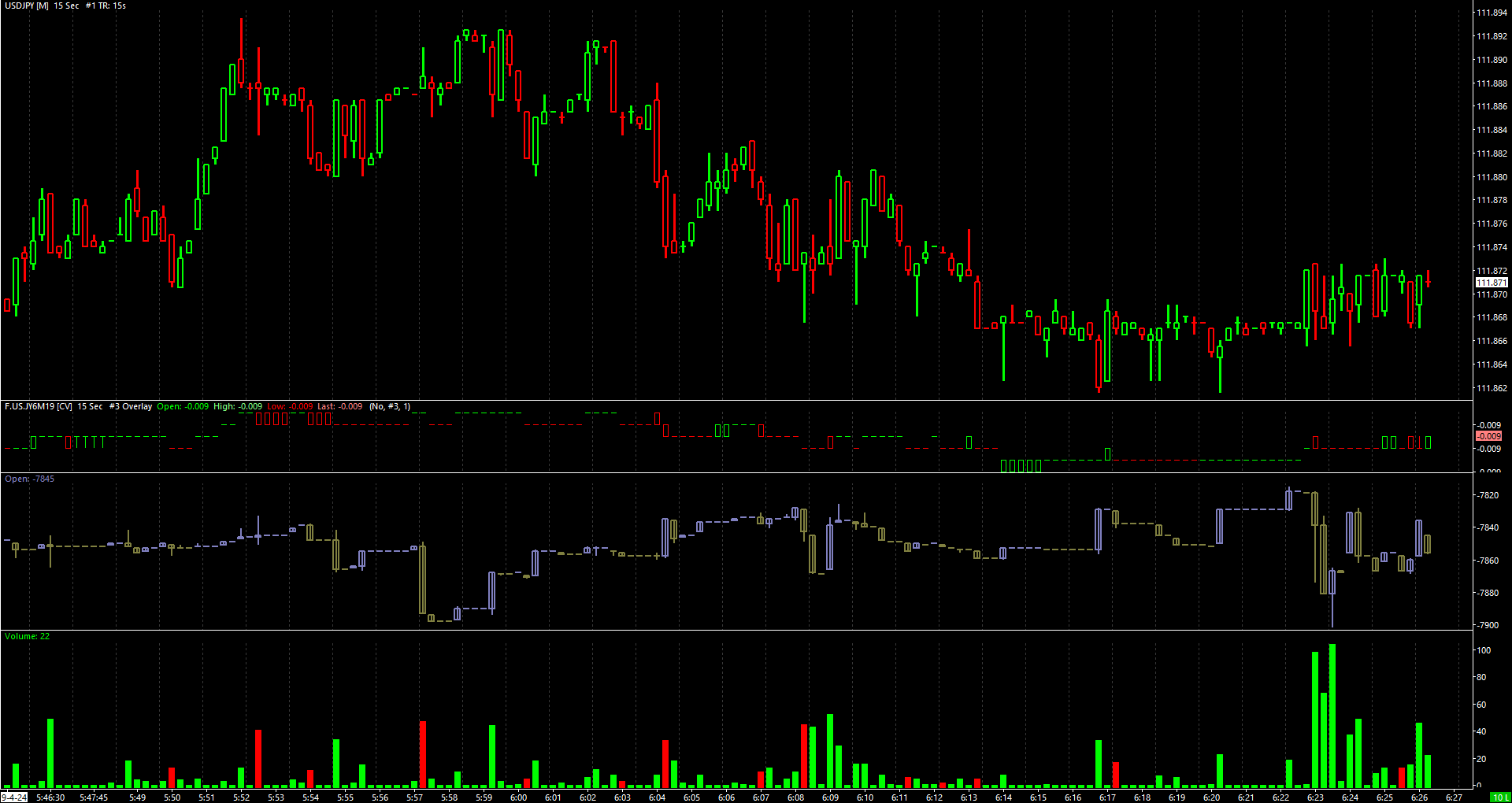 That's surprising since all the bars eventually do display even though some have zero volume. Refer to the attached F.US.JY6M19 15 Second chart image. The core reason for the request was to be able to overlay futures Cumulative Delta (-1 multiplier) and Volume studies onto the USDJPY Spot chart. Refer to the EURUSD 15 Second Chart image. The problem is that I cannot get consistent alignment of the futures data onto the spot chart. Sometimes it aligns well and at other times it can be multiple bars misaligned. Is it possible to lock the overlay studies to the exact same time on the Spot chart? This is also evident on higher time frames especially when scrolling back a few days. I have tried both "Bar Time Matching Method" options in the overlay studies without success. Date Time Of Last Edit: 2019-04-23 11:06:04