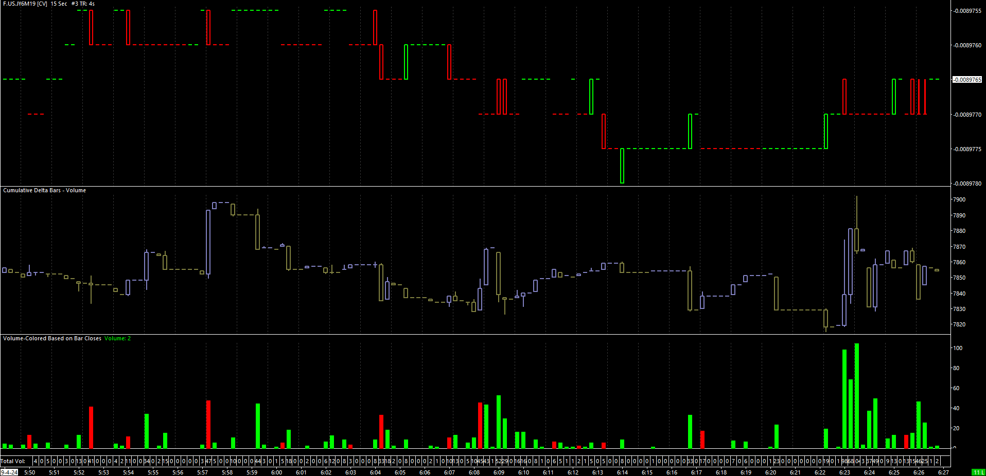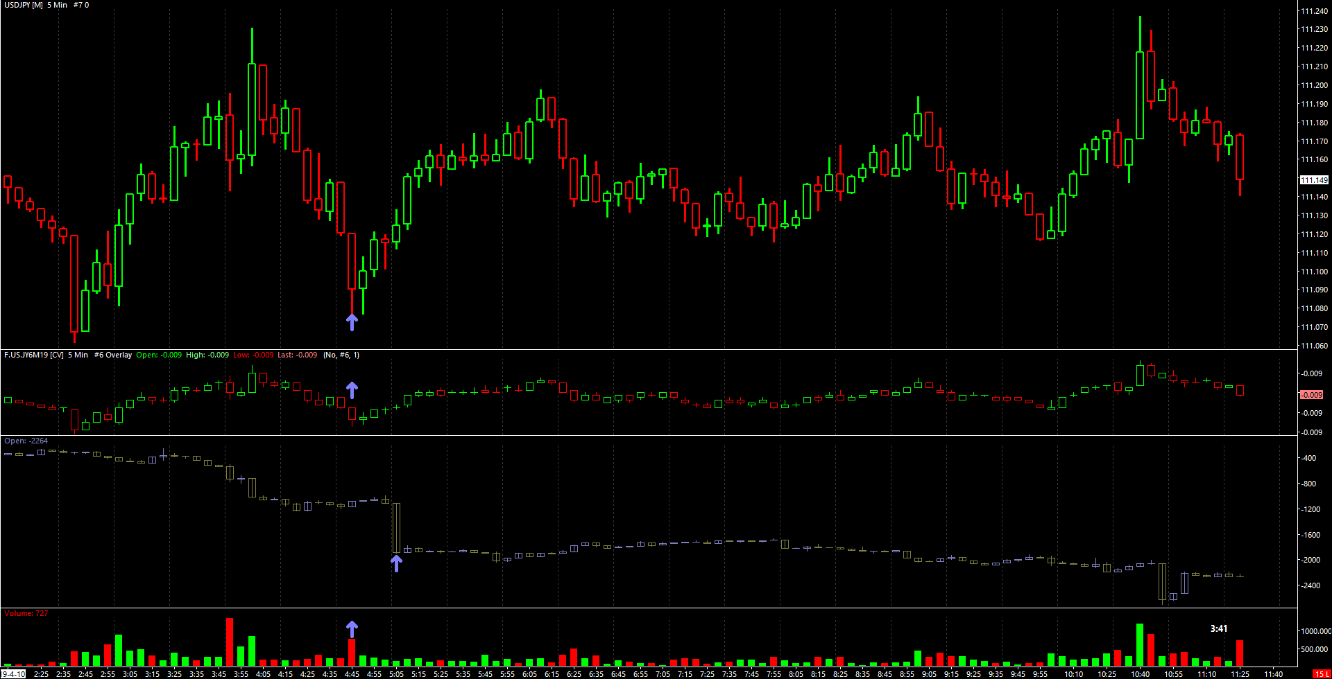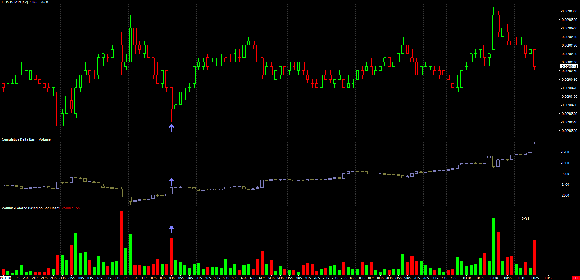 Thanks, I have unchecked the "Allow Zero Values". To clarify what I meant by "Is it possible to lock the overlay studies to the exact same time on the Spot chart?"... I want to have the Cumulative Delta and Volume study information on the F.US.JY6M19 futures chart to be shown on the USDJPY Spot chart at exactly the same time. So, the 5:00:00 futures information will be shown at the 5:00:00 bar on the spot chart, the 5:00:15 futures information will be shown at the 5:00:15 bar on the spot chart, etc. These two chart show alignment http://www.sierrachart.com/image.php?Image=155607637971.png http://www.sierrachart.com/image.php?Image=1556076419312.png Note: Cumulative Delta is multiplied by 1 in the spot chart, so it is inverted as compared to the futures chart. The following two charts show how the Cumulative Delta can be misaligned http://www.sierrachart.com/image.php?Image=1556077281903.png http://www.sierrachart.com/image.php?Image=1556077351911.png |