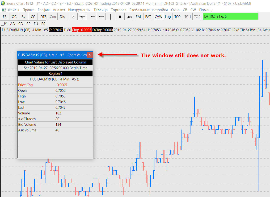 We are aware of the tab coloring limitation and we are still working on that. However, there is no problem with the Chart Values Window. Nothing has even changed with that. What is the problem you are having with the Chart Values window? Sierra Chart Support - Engineering Level Your definitive source for support. Other responses are from users. Try to keep your questions brief and to the point. Be aware of support policy: https://www.sierrachart.com/index.php?l=PostingInformation.php#GeneralInformation For the most reliable, advanced, and zero cost futures order routing, *change* to the Teton service: Sierra Chart Teton Futures Order Routing |