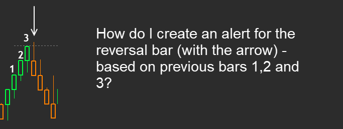 Try this: =AND(C[-3]>O[-3],C[-2]>O[-2],C[-1]>O[-1],C<O,H>H[-1]) |