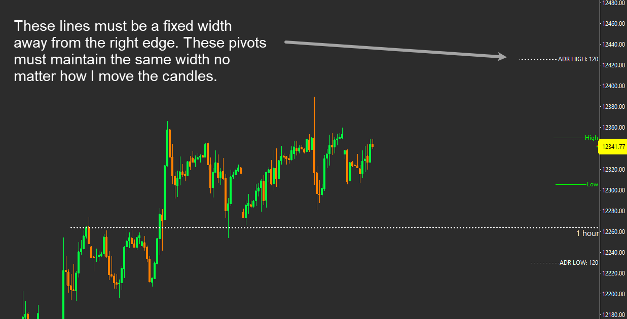 I have some lines that adjust as price moves up and down. I want these pivot lines to maintain a set distance away from the right edge. In the 1st image, the lines project from last bar to the edge. This is distracting. I would like it to function as in the 2nd image. How do I do it? Date Time Of Last Edit: 2019-04-30 11:58:37