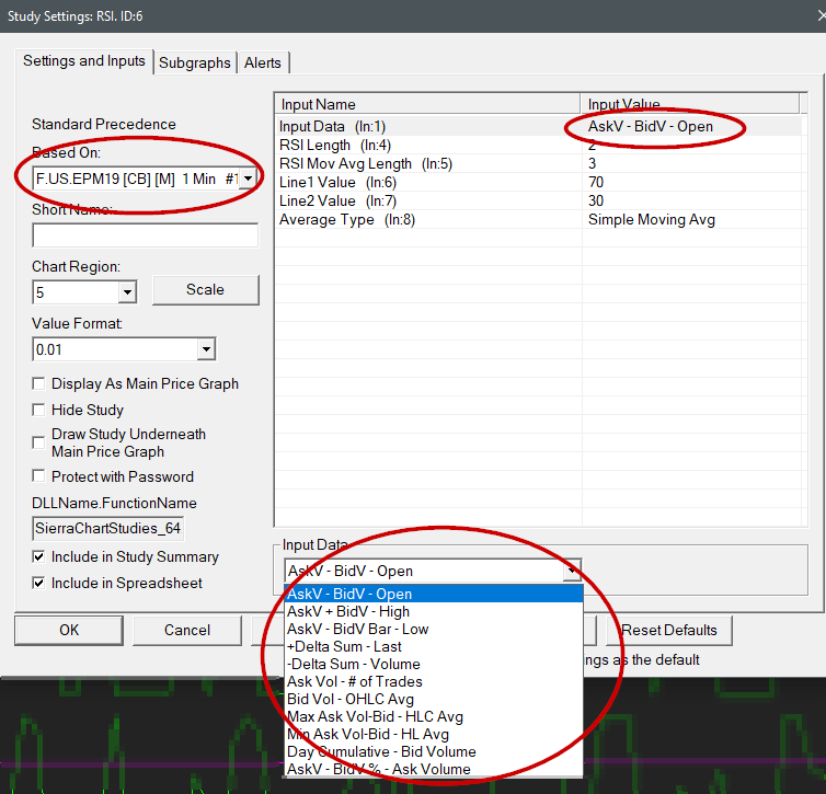 Here is the scenario: I have added a Study/Price Overlay Subgraph of a chart (in this case it's a 1-minute chart of the ES mini). The main chart contains a 1-minute of VIX Then I added an RSI applied to the Study/Price Overlay Subgraph. The problem: When selecting the input data for the RSI (Input Value), I do not get an option to select the last price. Is there a way to select the "last price" or an alternative to it? See attached for reference. Thanks so much |