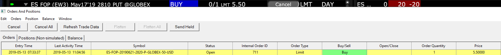 Hi, I'm having trouble loading the option contracts for ES June 2019. If I click the "Get Options" button, it doesn't return anything. However, if I select ES September 2019, I can get the options. Another issue: if I go to the IB platform and if I place a buy limit order for, say, the weekly ES Put 2785 expiring 2019-05-17 (class EW3), Sierra Chart can "see" the order, but it thinks it's for a different contract! Sierra chart sees the order as a buy limit order for the ES-FOP-20190621-2820-P-GLOBEX-50-USD contract, which is something completely different! Could you please take a look into this? Thanks EDIT: attaching a screenshot of the order as seen on IB's Trader Workstation vs "Orders and Positions" window in Sierra. EDIT 2: in case this helps debug, there's one option contract that I traded today and that Sierra has loaded with a very weird symbol: ES-FOP-20190621 08:30 CST-2800-P-GLOBEX-50-USD. Notice that it includes time and timezone, in addition to the expiration date. That looks weird, so I thought might help debug. Date Time Of Last Edit: 2019-05-13 18:09:28