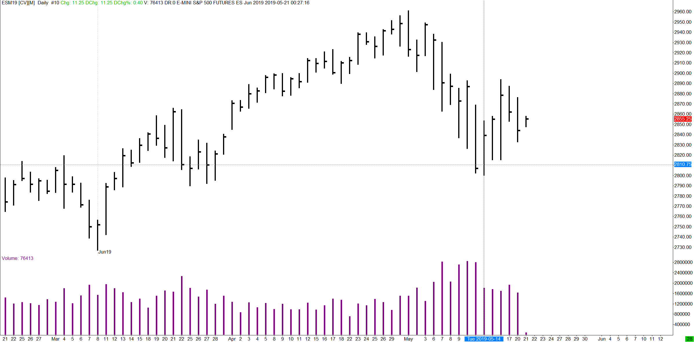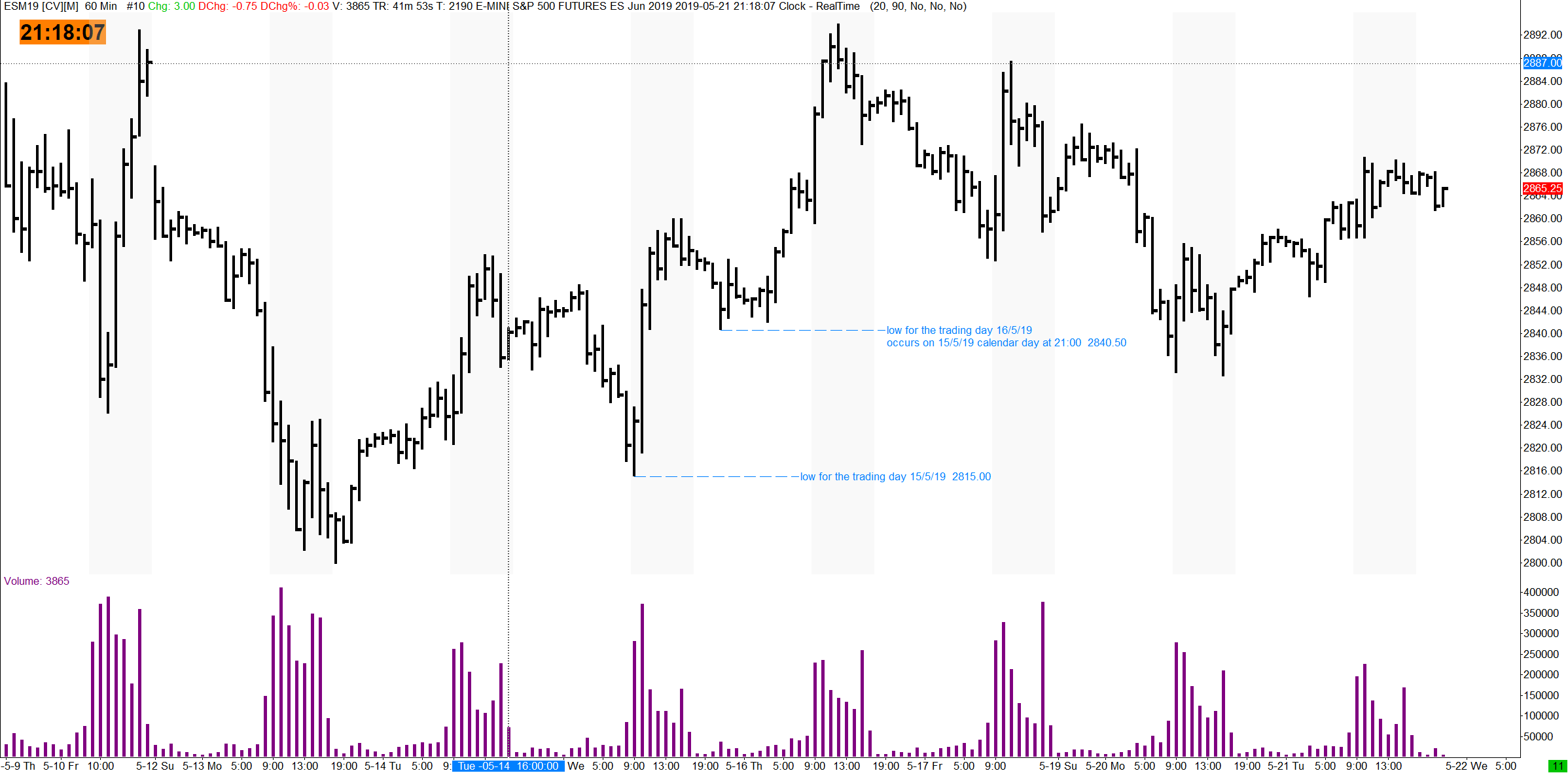 That's interesting as that's where I was looking also on the daily chart here: https://www.cmegroup.com/trading/equity-index/us-index/e-mini-sandp500_quotes_globex.html?optionProductId=138&optionExpiration=138- Further, if you look at the intraday chart the low for the trading day is 2840.50 on 16/5/19 not 2815.00, it didn't come near it. I understand the difference between the last traded price and settlement price for the day's close but this doesn't explain the intraday price difference. Intraday chart attached. http://www.sierrachart.com/image.php?Image=1558487891935.png |