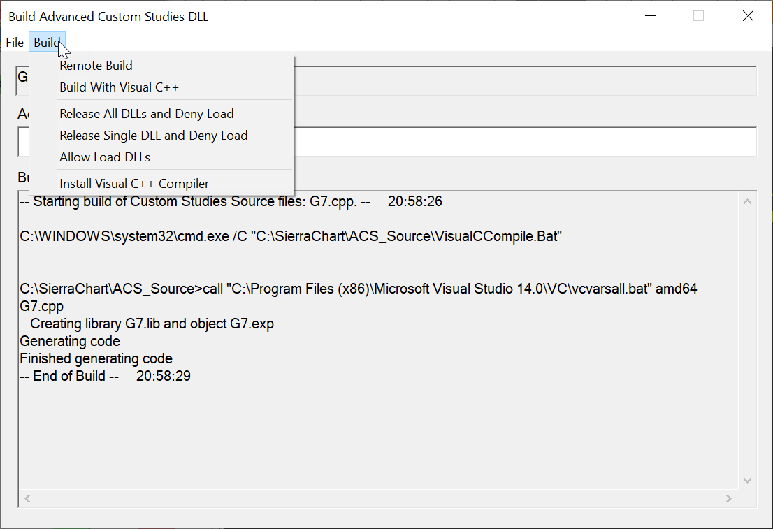 Update to the latest version of Sierra Chart and you will have the option for Build With Visual C++ - Debug. The instructions to perform a Fast Update can be found here: Software Download: Fast Update Sierra Chart Support - Engineering Level Your definitive source for support. Other responses are from users. Try to keep your questions brief and to the point. Be aware of support policy: https://www.sierrachart.com/index.php?l=PostingInformation.php#GeneralInformation For the most reliable, advanced, and zero cost futures order routing, *change* to the Teton service: Sierra Chart Teton Futures Order Routing |