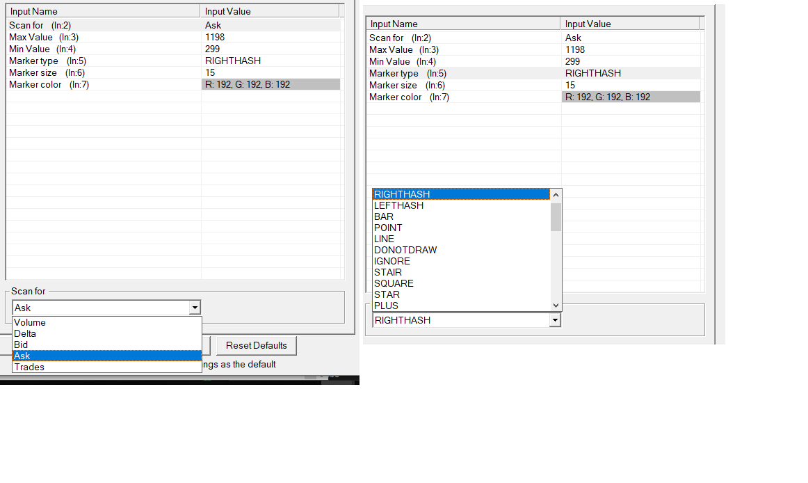 OK, I am reverting back to previous version. I do not know the developer as I downloaded this from your forum very long time ago. So, since I have no contact with him/her, is there any chance that you could please develop the following study in SC? I am not a developer myself and do not have any contacts. This study seems relatively easy (to me, I cannot really assess). It is used with Numbers Bars and it could plot either real time or after the bar is completed. The feature is as follows: In numbers bar, plot (for example) a dash at the price leve where ask/bid/delta/volume is in the range from (a number) to (a number). I am attaching a screenshot of the settings. There are 6 variables as inputs. I am sorry for asking you to develop a study but maybe someone else could benefit from it and since I downloaded in your forum it can be a part of SC. Thank you in advance. Kind regards, Hana |