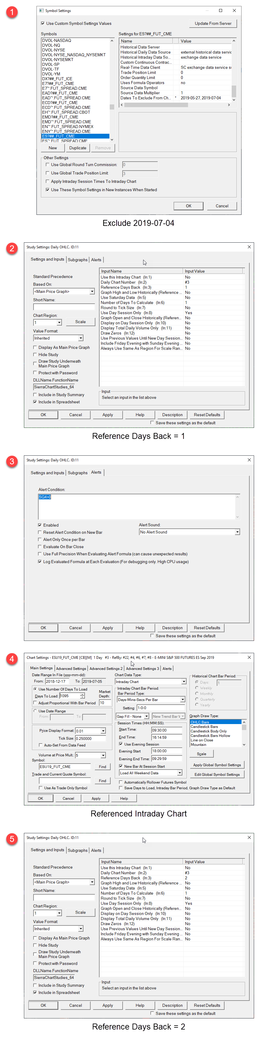 When using the "New Global Symbol Setting to specify dates to exclude from chart" the Daily OHLC study does not seem to exclude the date. Using the ES, excluded 2019-05-27, with a Daily OHLC study with a Reference Days Back of 1 and the SG4 - Close is not correct. Changing the Reference Days Back to 2 the SG4 - Close value is correct. |