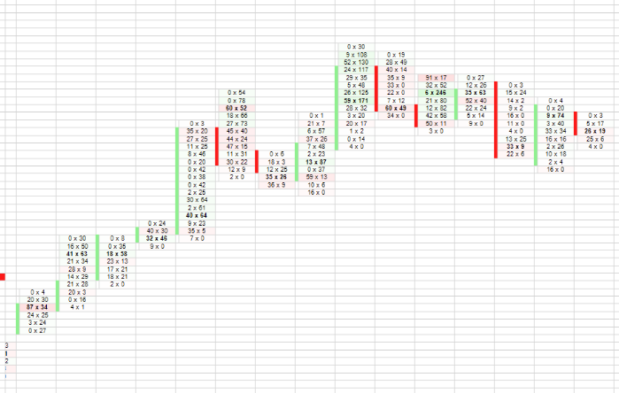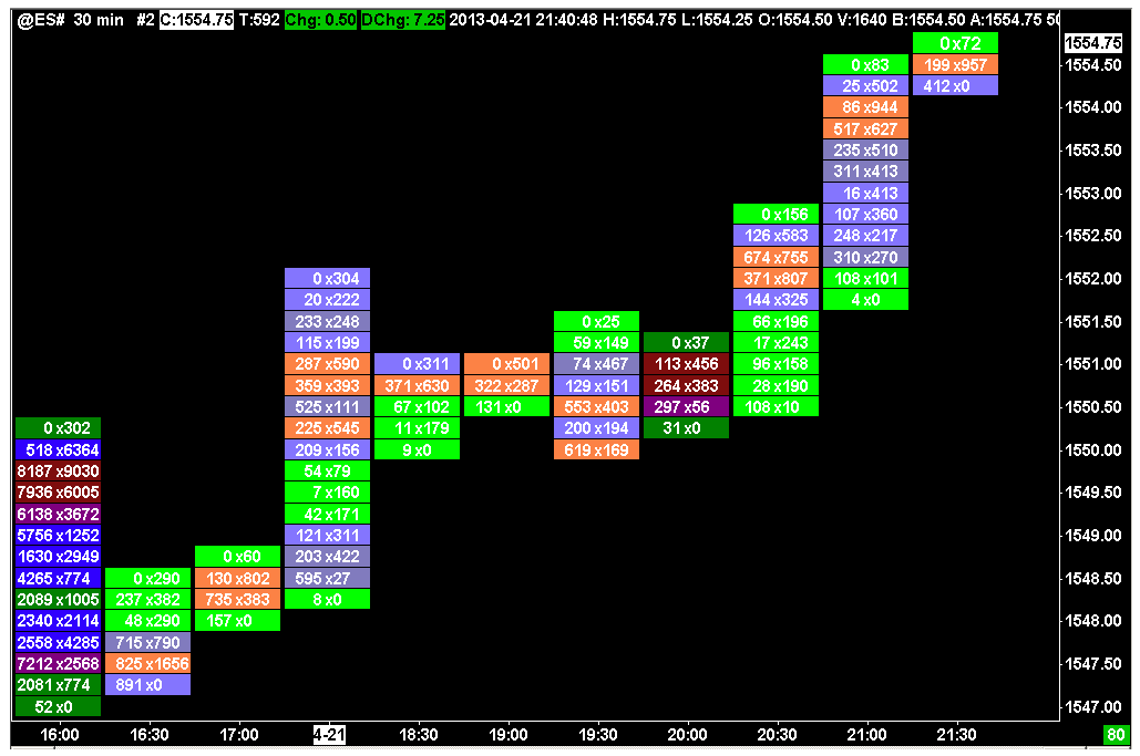 Attached is a Study Collection that has a very basic Numbers Bars study in it to help get you started. The Numbers Bars is set to display the Bid x Ask totals for each bar and price along with coloring the bar based on the Total Volume. You would just need to change the colors to match the image you provided. Here is the documentation for how to use the Study Collection file we provided: Study Collections: Using a Study Collection Provided by Sierra Chart Support You will find the documentation for the Numbers Bars study here: Numbers Bars For the most reliable, advanced, and zero cost futures order routing, use the Teton service: Sierra Chart Teton Futures Order Routing |