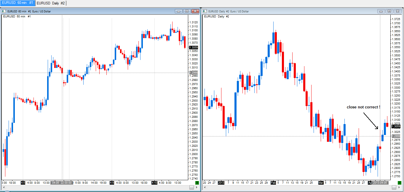 Come on, what are you trying to tell me here!e.g. in the EUR/USD we had a strong up day on Friday but your Historical data is showing a down day. We are not talking about a few pips. The close of your intraday chart is 1.2997 the close of the historical is 1.2921 which is a difference of 76 pips. To help you get on track ... at what time does the day close for the Historical data? The last time this 1.2921 level was reached is around 07:25 AM EST but the high of the day 1.3039 wasn't reached before 10:50 AM EST. Please take the time to have a closer look and possibly fix it. Thank you. P.S. Once again, this issue is not only on the EUR/USD. |