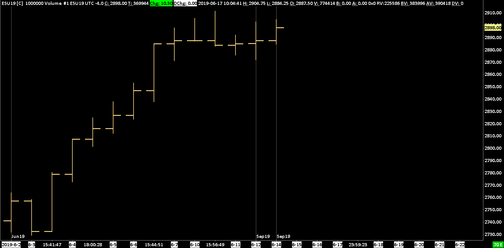 We see you are using IQ Feed. What is the reason to use IQ Feed? You are going to get a much better quality of service and much lower cost by using the Sierra Chart Exchange Data Feed: Sierra Chart Exchange Data Feed Anyway, we are not observing this issue: http://www.sierrachart.com/image.php?Image=1560780411267.png (Updated screenshot. Disregard the duplicate September 2019 line at the end of the chart. We will take care of that. ) Therefore, the issue you are having would seem to be related to an IQ Feed out of order time stamping problem. Another reason to use our data feed. There is no reason not to use it. You are going to be better off. You also need to disable this option: Chart Settings: New Bar at Session Start (Chart >> Chart Settings >> Session Times >> Intraday Chart Session Times menu) Sierra Chart Support - Engineering Level Your definitive source for support. Other responses are from users. Try to keep your questions brief and to the point. Be aware of support policy: https://www.sierrachart.com/index.php?l=PostingInformation.php#GeneralInformation For the most reliable, advanced, and zero cost futures order routing, *change* to the Teton service: Sierra Chart Teton Futures Order Routing Date Time Of Last Edit: 2019-06-17 14:07:31
