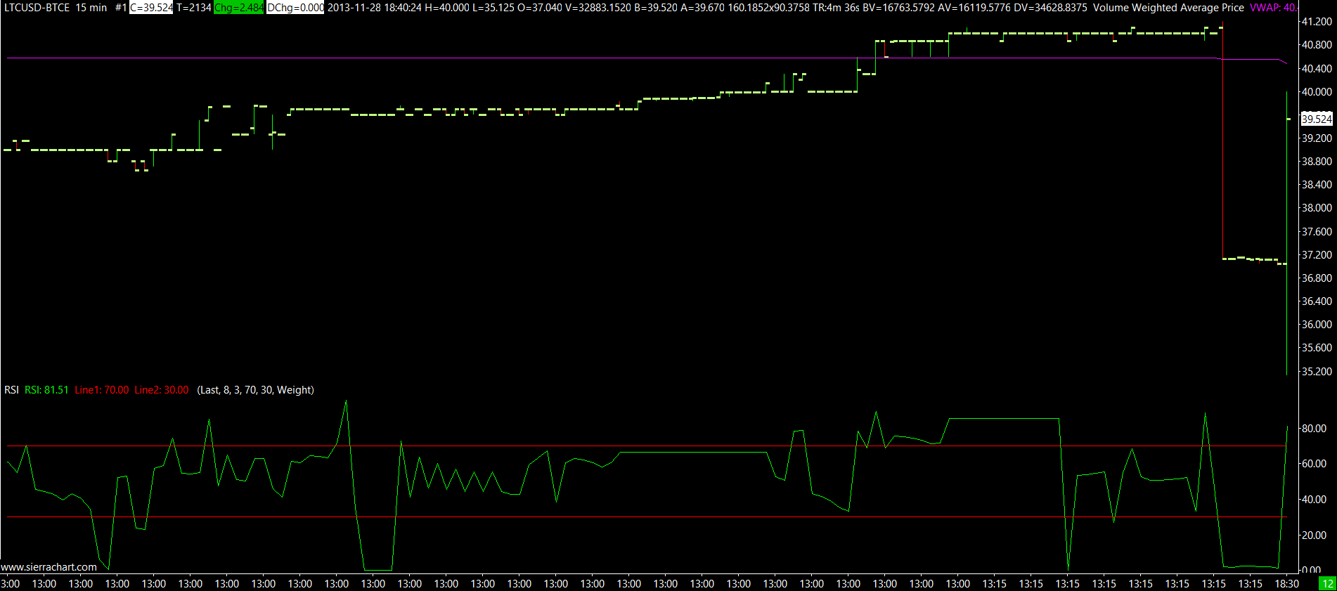 So I opened sierra charts this morning and they're completely screwed upf or me and I can't figure out how to fix it. I tried restarting everything, removing my studies etc. Any help would be greatly appreciated thanks. Notice the time codes at the bottom are supposed to be set to 15min intervals and it's using the LTC/USD info from BTC-e. Let me know if you need any other info or screen shots from my settings or something. http://www.sierrachart.com/image.php?l=1385664033677.png |