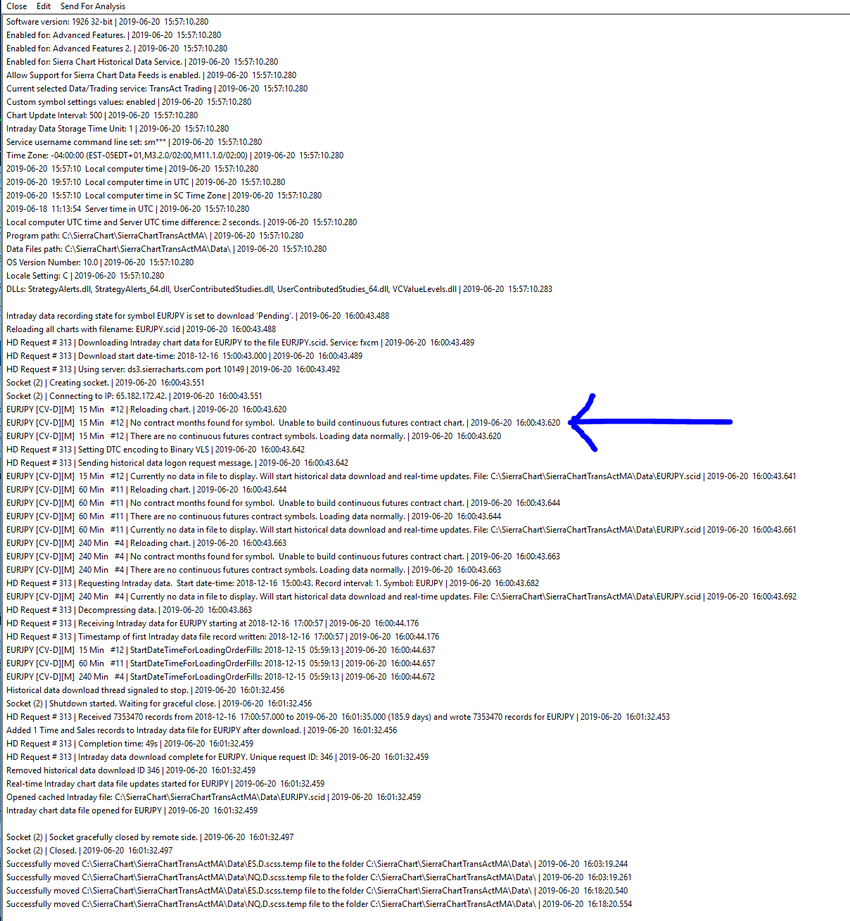 I am exploring expanding my futures trading on SC to include FX. I am aware of the FXCM broker options as described in "https://www.sierrachart.com/index.php?page=doc/SCRealTimeFOREX.php". My current SC trading is via TransAct for Futures and my Data/Trade Service Settings is "TransAct Trading" and the "Support Alternative Forex Historical Data selection is enabled. This is NOT in line with the SC instructions which indicate "SC Data - All Services [data]" and could be the principal source of my data limitations set out below (see Message Log 1). That said, for this support request, I am working with FX symbol EURJPY and my account info/type is set out in Message 3. Building my chartbooks, I have followed the chart establishment instructions as described in the above link to set up a series of historic and intraday charts. Historical data appears to download as expected. Intraday data seems to be limited to approximately "Feb. 16, 2019". This is confirmed in attached Message Log 2. Post Edit/Delete All data and Download, the Message Log "No Contract months found for symbol" (see attached Message Log 3) seems to be the limitation of building out an expected chart. It is my experience that these errors are either User Errors or Account Limitations. Is it possible to build out an intraday chart that has real-time data back to the indicated available 2007 period and if so, what changes should I be making to enable such? Thank you. |