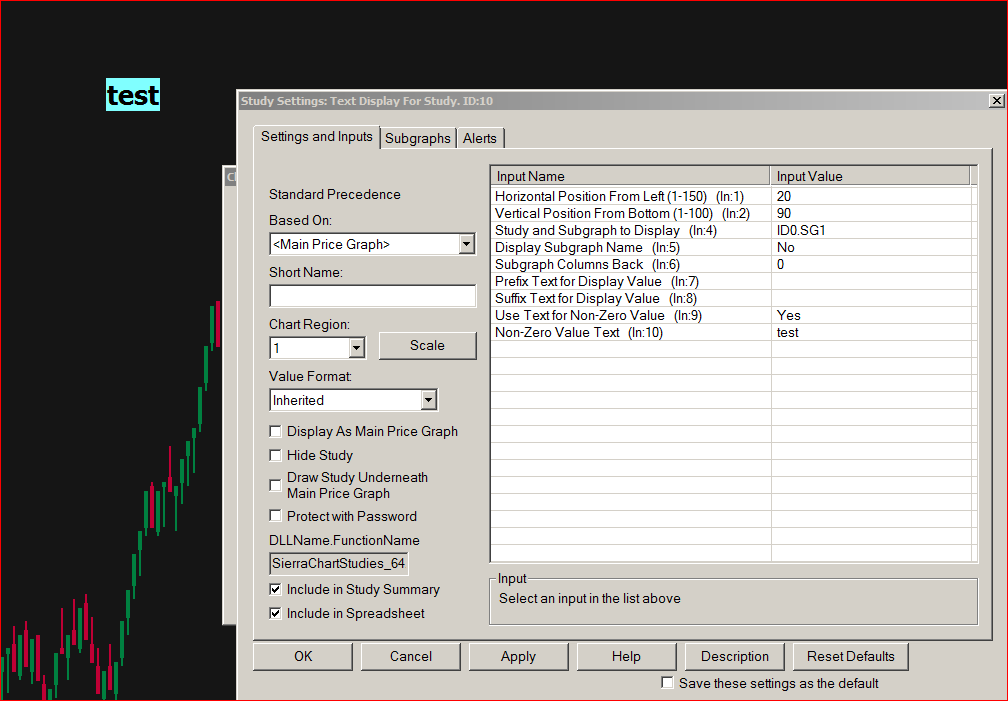 Thanks.. I followed your directions and I end up with a light blue vertical rectangle in upper left hand corner of chart. The text I enter into "enter non zero value text," is not appearing. I tried adjusting the Subgraphs to no avail. The text I tried entering was "ES" Appears I'm missing something? |