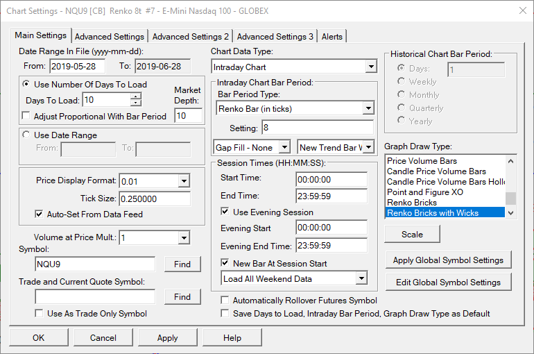 Hello Support, I have had this problem for a while but lately it became substantially more exacerbated. SC is crashing if I am working with Renko charts. Initially I thought this may be caused by an extensive calculation necessary for the Renko format so I have cut down the number of days loaded to only 10 days (even though this substantial impacts my ability to do analyses on a longer period of time). This did not help. If I have Renko chart for NQ (or any other futures market) open in a higher format the platform is more or less stable. However, if I try to zoom in into a lower time frame on the same chart - Sierra Charts crashes and shuts down. Example: NQ Renko chart of 8 ticks is more or less stable (almost never crashes) but switching down to 4 ticks Renko on the same chart almost immediately shuts the platform down. I am attaching an image of my Renko chart configuration. Quick note: I am projecting the drawings on this Renko chart from another chart with a higher time frame but I don't think this is what 's causing a problem. Other charts with the same drawings projected are NOT crashing the platform. It is ONLY happening when I try to manipulate the setting of the Renko chart, specifically zooming in to a smaller timeframe or adding substantially larger number of days to load This is not a corrupt chart or a chart book because I have tested extensively by opening a brand new chart book and a single new Renko chart. After one or 2 clicks or manipulations with Renko chart the platform still crashes. I am running Sierra Chart version 1928 64-Bit on Win-10 Professional 64-Bit. The server is quite capable of handling any workload so I seriously doubt this is a resource limitation: Processor - Intel(R) 64-Bit Core(TM) i7 CPU 950 @ 3.07GHz - 3.83 GHz Installed RAM - 24GB Any suggestion on what could be the root cause of these crashes? Date Time Of Last Edit: 2019-06-30 02:23:49