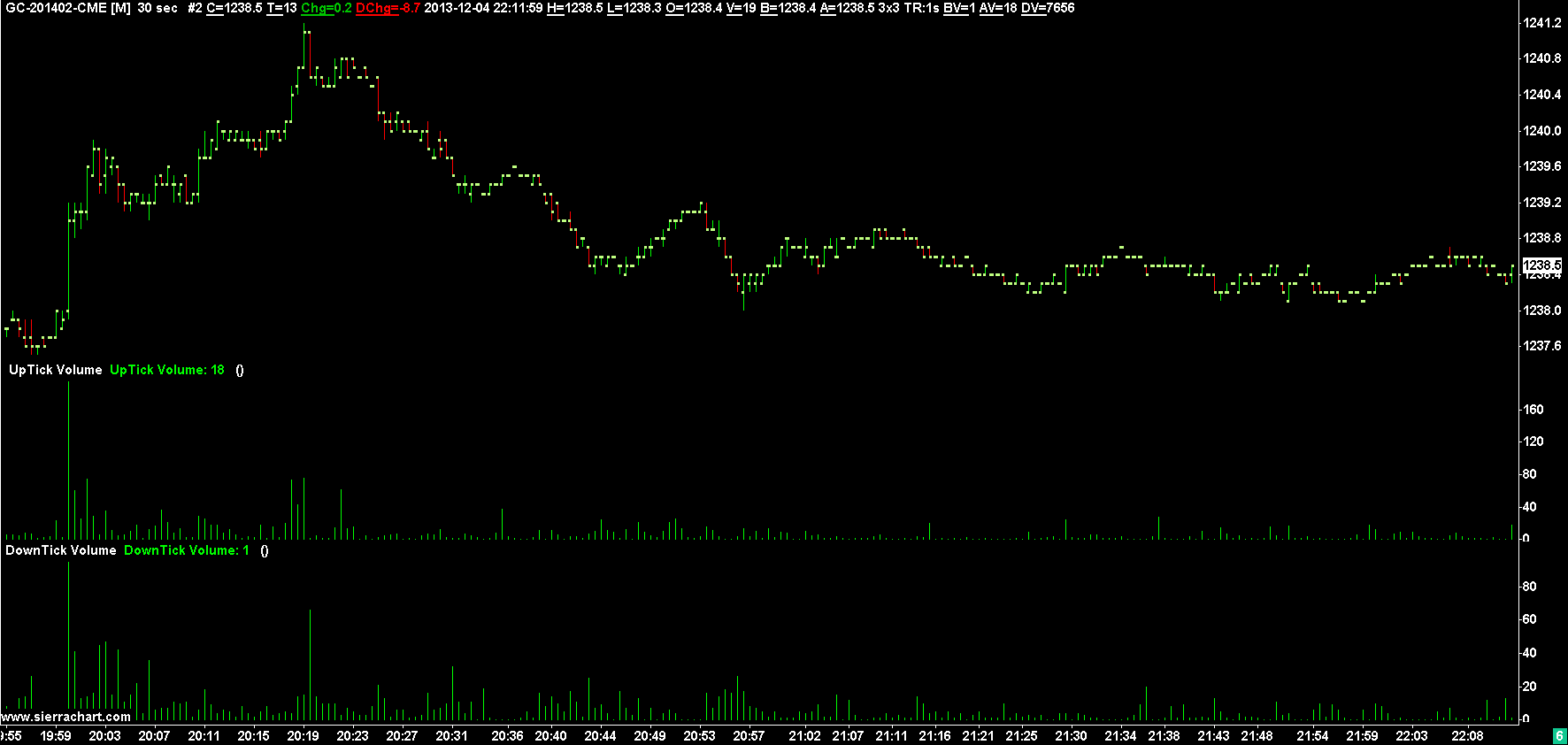 Dear Support, Attached is a chart of 30 seconds for the GC 2014 Feb futures. Data provider is Interactive Brokers with the "Intraday Data Storage Time Unit" set to 1 tick. There are only 2 studies on this attached chart: - Up Tick Volume - Down Tick Volume For some reason, Down Tick Volume will NOT load during live data but will load historically (noticed that there are times when Down Tick Volume is completely at zero for extended periods). What is going on and how do I fixed it? It was not like this last Friday. I doubt it is with Interactive Brokers as it was working just fine - up until last Friday ... Date Time Of Last Edit: 2013-12-03 00:58:03