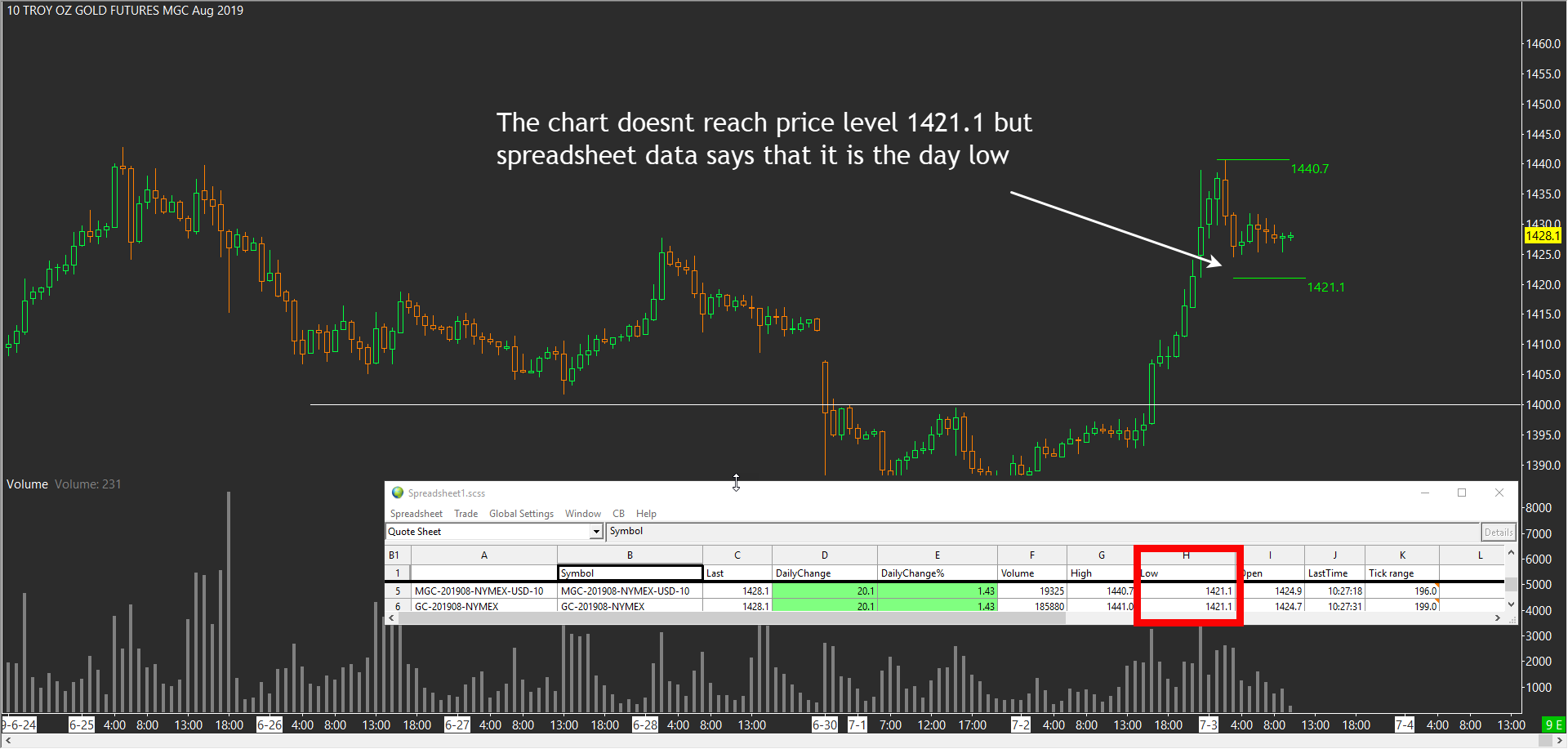 MGC-201908-NYMEX Spreadhseet data show that the low of the day (03 July 2019) was 1421.1 The chart candles don't appear to reach that level. High of the day correlates perfectly. See screenshot. The spreadsheet data is pulled off the daily chart with normal session times of midnight to midnight. |