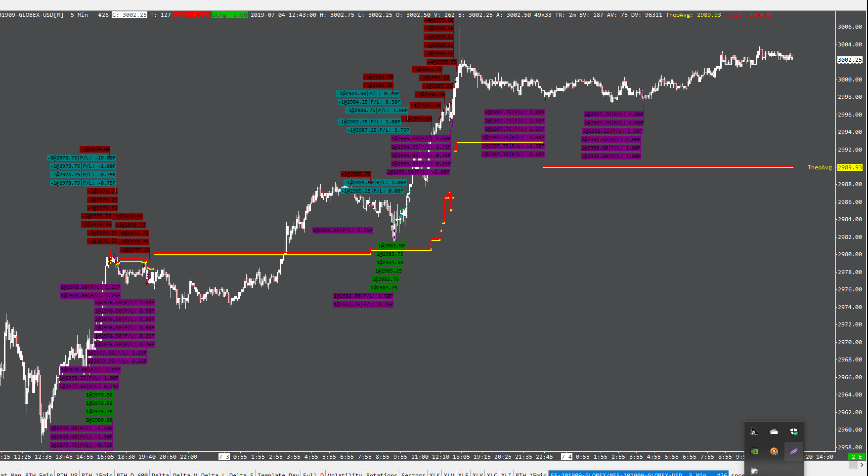 Hello, It seems that there is some inconsistence in presentation of OrderFill markers. This breaks calculation of current position and perhaps some other aspects of the application. I have a simple 5-min chart of ES (with MES set as trading symbol and "Use as Trading symbol" being ON). Between morning of Jul 3, 2019 and early hours of Jul 4, 2019 (all in US Eastern time zone) I had few trades. Last one was short with multiple entries into MES that I left open after CME closed at 13:15 US Eastern. This trade was closed during the following night (as 1 limit order for 12 lots, that worked and later as a set of manual transactions). Here is the issue. Unfortunately, I can't find a way to reproduce it, but sometimes on one of my computers I see chart with all order fills during this period of time. But if I create new chart and want to plot Order Fills, I see only last overnight trades. In this case it looks like opening long position instead of closing short one. Another issue is that if I create new chart just for MES (while leaving trading symbol field empty), there is no OrderFill markers as one would expect since all trades were done against this symbol. I'm attaching screenshots of charts as well as my Trading Log. Thank you very much Date Time Of Last Edit: 2019-07-04 22:14:28