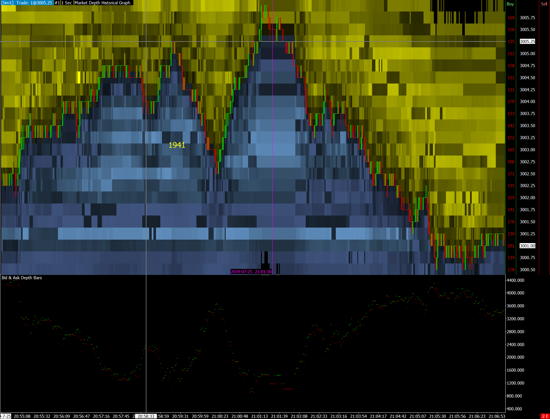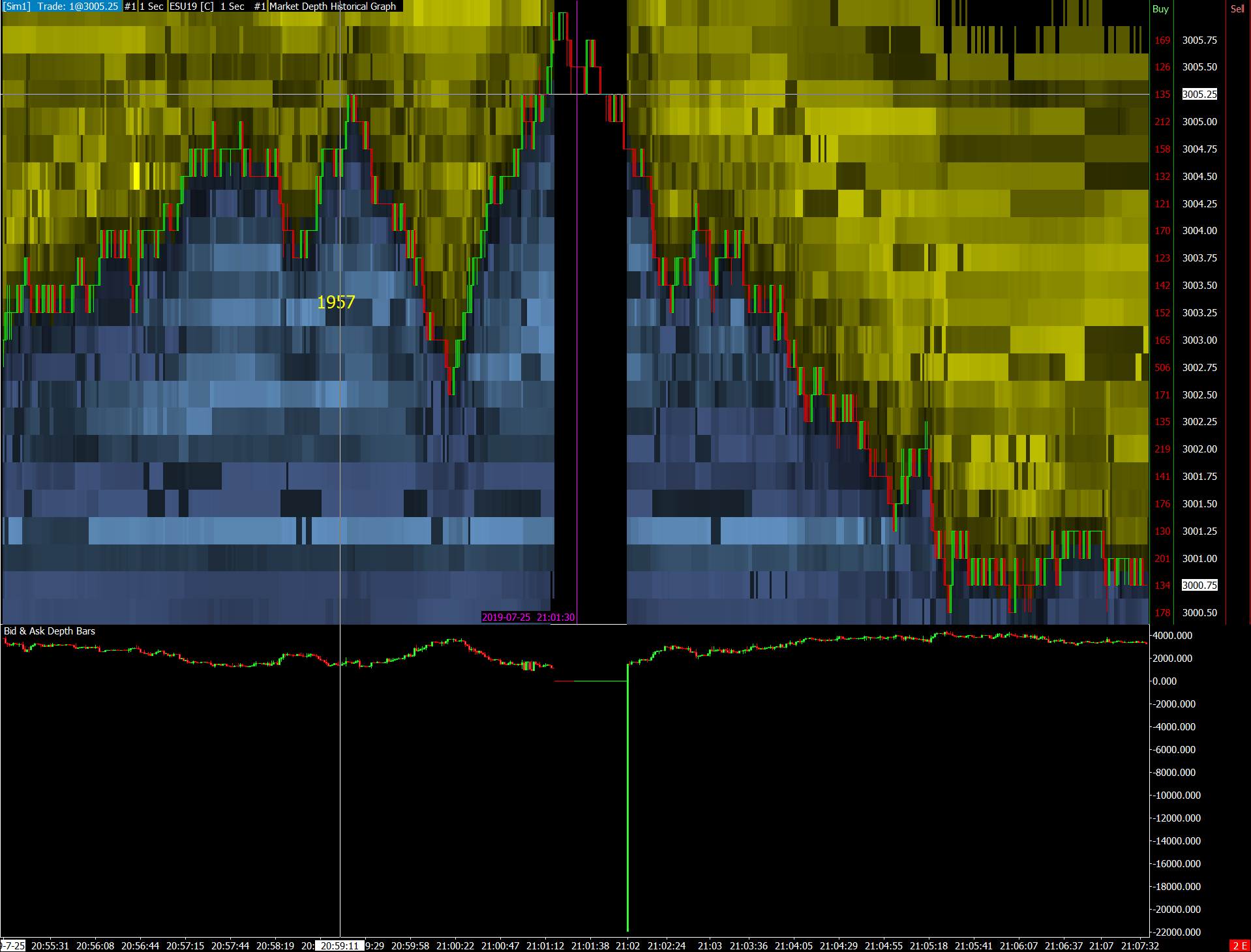 the chart is from a Destination instance as described here https://www.sierrachart.com/index.php?page=doc/MultipleServices.html#AccessingMarketDataFromOtherInstancesOfSierraChart_Instructions At the time of the screenshot this was the setup: Source instance 1941 Destination instance 1957 Please find attached the chartbook I have also experienced the issue having 1957 on Source and Destination instance but the downgrade didn't solved --------------------- I have noticed that if I add a Market Depth Historical Graph study, there is an hole in the DEPTH data but the file is the same (previously recorded in the Destination instance 1957) 1941, no hole http://www.sierrachart.com/image.php?Image=1564131488804.png 1957, there is a hole http://www.sierrachart.com/image.php?Image=1564131447703.png |