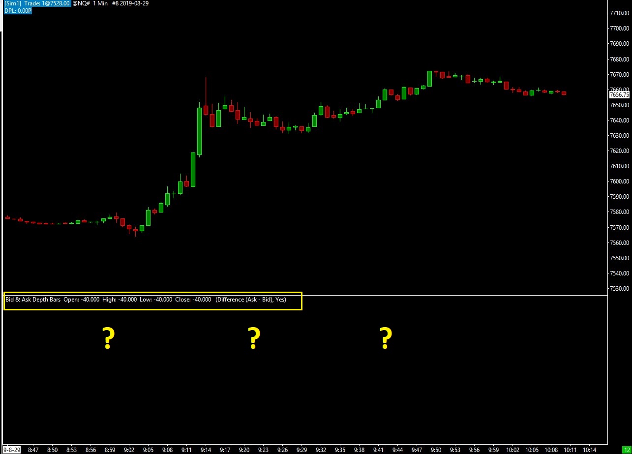 We see you are using IQ Feed. We tested this with IQ Feed and we do see the bars: http://www.sierrachart.com/image.php?Image=1567108328854.png Remove the study from the chart and add it again. And go to File >> Open Market Depth Window: File Menu: Open Market Depth Window (File) And let us know if you see 10 levels of depth. Sierra Chart Support - Engineering Level Your definitive source for support. Other responses are from users. Try to keep your questions brief and to the point. Be aware of support policy: https://www.sierrachart.com/index.php?l=PostingInformation.php#GeneralInformation For the most reliable, advanced, and zero cost futures order routing, *change* to the Teton service: Sierra Chart Teton Futures Order Routing Date Time Of Last Edit: 2019-08-29 19:53:02