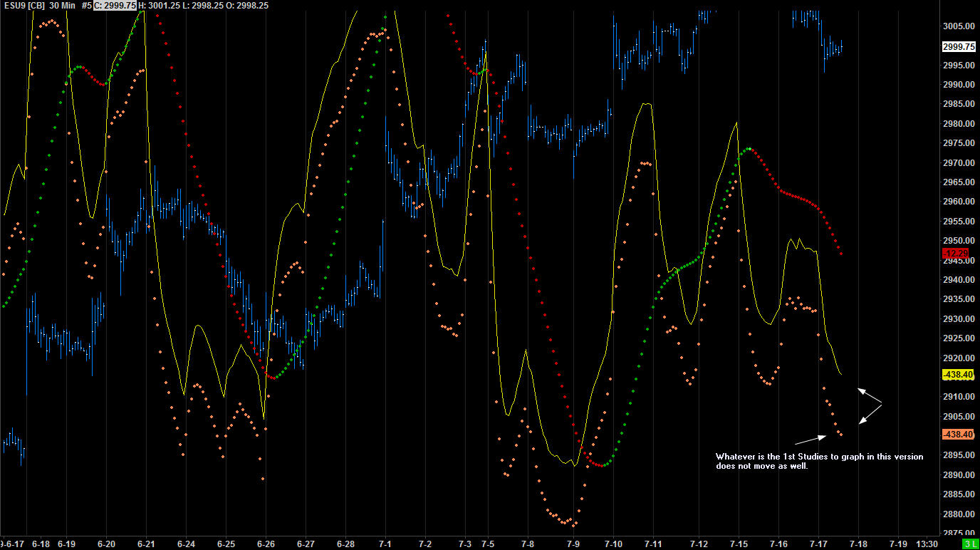 This is just a Scaling issue. There are a couple of possibilities for what you are seeing. The most likely, given your statement about the first study, is that you have the Left Side Scales turned on. When this is on, the first appropriate study will use the left side scale instead of the one on the right with the rest. Refer to the following for this: Chart Settings: Use Left Side Scale (Chart >> Chart Settings >> Scale menu) The other possibility is simply that those studies are not using a Scaling setting of Automatic. Check each study and ensure that they are all set to Automatic (or if not, then be aware that they will not scale with the other items in the chart). Refer to the following for how to set the scale for a study: Chart Scale and Scale Adjusting: Opening the Scale Settings Window For a Study For the most reliable, advanced, and zero cost futures order routing, use the Teton service: Sierra Chart Teton Futures Order Routing |