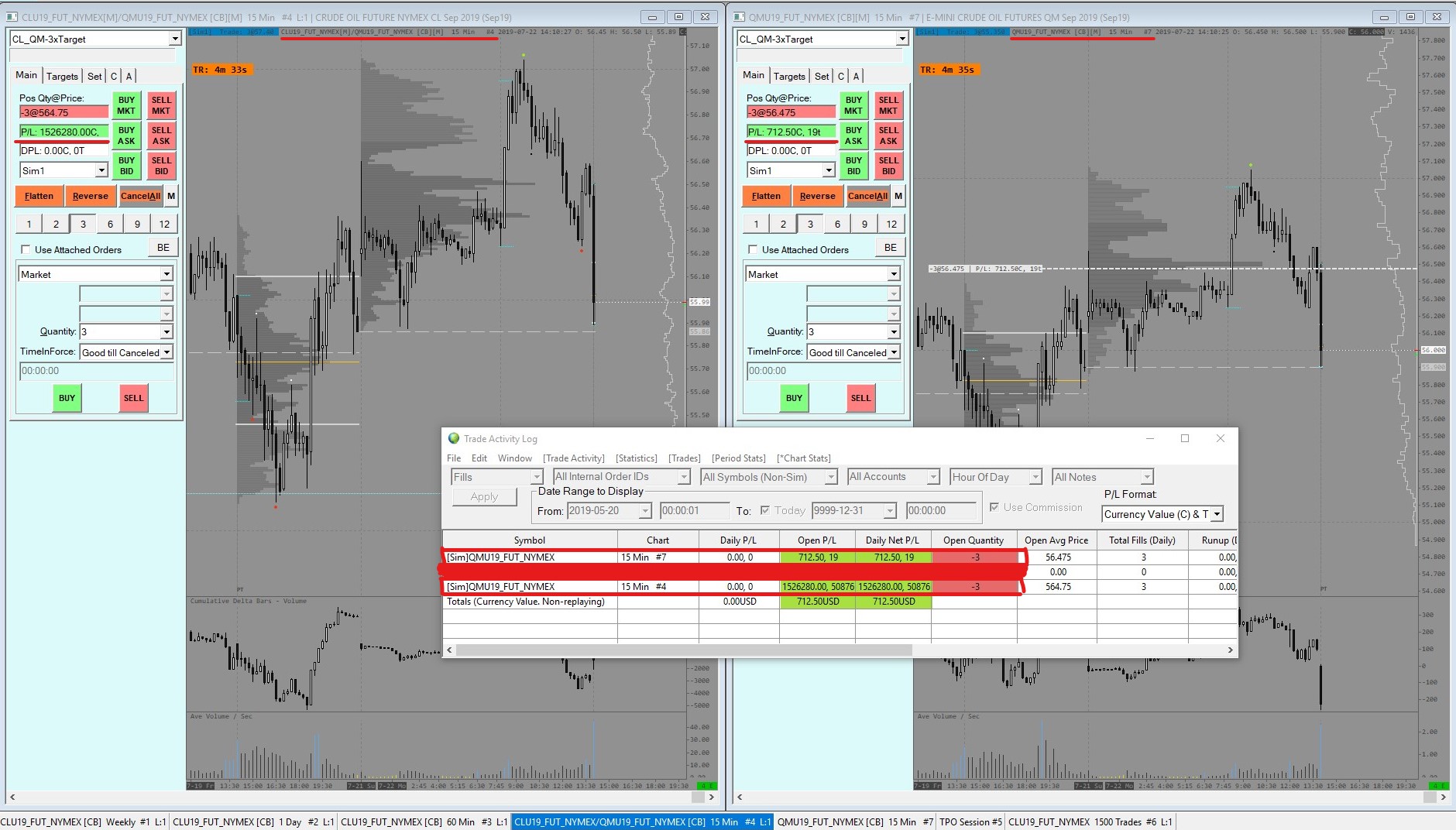 Hi support I'm having some trouble setting up my charts to use the Trade and Current Quote Symbol option. I want to chart on the full CL contract and execute on QM. I have attached a screenshot which relates to the notes below. Chart on left (chart #4) Symbol: CLU19_FUT_NYMEX Trade and Current Quote Symbol: QMU19_FUT_NYMEX Use As Trade Only Symbol: Checked Chart on right (chart #7) Symbol: QMU19_FUT_NYMEX One trade only of -3 contracts was executed on the left chart (#4) Under the Trade Panel and the Trade Activity Log chart #7 shows the correct P/L of 19 ticks. Chart #4 shows the exact same order but the P/L as 50876 ticks which is obviously incorrect. I have been through the documentation and what is described there with respect to "Use As Trade Only Symbol" and tick size is not what I am seeing on my charts. Can you please comment on wether this is working as intended? In addition: Chart #4 "Show Orders and Position" is checked but the position line is not shown on the chart. Is it possible to have the position and order lines shown? When "Use As Trade Only Symbol" is NOT checked the last trade price box disappears from the price scale. Is this intended? Note: When the "Trade and Current Quote Symbol" option is not used both charts behave as expected. Many thanks |