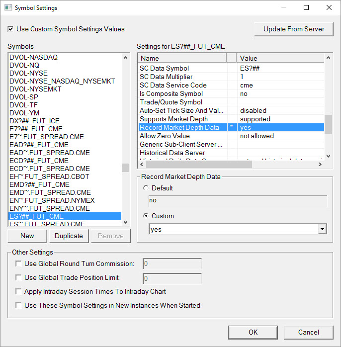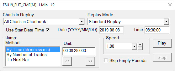 I have attached a few things. 1) The replay settings - Please note, the "Skip Empty Periods" box isn't checked. I have tested both with this box populated and un-populated, both yield the same results. 2) Symbol Setting - This shows I have the Record Market Depth Data set to yes. Also the "Use Custom Symbol settings" is also populated. 3) Chart Settings - Not sure if you need this one or not. Please note, I also have a 1min bar chart open and T&S. The following values have been linked to both the DOM 1min chart: "Symbol", "Session Times" and "Days to Load". With regards to the T&S, it is attached to the DOM. I have tested without the 1min chart, which yields the same results. Please note: I have only tested this with CL and ES. Please let me know if you need anything else! Thanks, Matt Here's the log: Replay 1.00X: ESU19_FUT_CME [C][M] #1 | Reloading chart. | 2019-08-08 11:37:11.367 Replay 1.00X: ESU19_FUT_CME[M] 1 Min #2 | Reloading chart. | 2019-08-08 11:37:11.477 + Loading market depth data. | 2019-08-08 11:37:12.799 Loaded depth data records for ESU19_FUT_CME 2019-08-06 from 2019-08-06 13:45:00 to 2019-08-06 18:59:59. | 2019-08-08 11:37:18.205 Loaded depth data records for ESU19_FUT_CME 2019-08-07 from 2019-08-06 19:00:00 to 2019-08-07 18:59:59. | 2019-08-08 11:37:20.748 Loaded depth data records for ESU19_FUT_CME 2019-08-08 from 2019-08-07 19:00:00 to 2019-08-08 08:30:00. | 2019-08-08 11:37:21.289 |