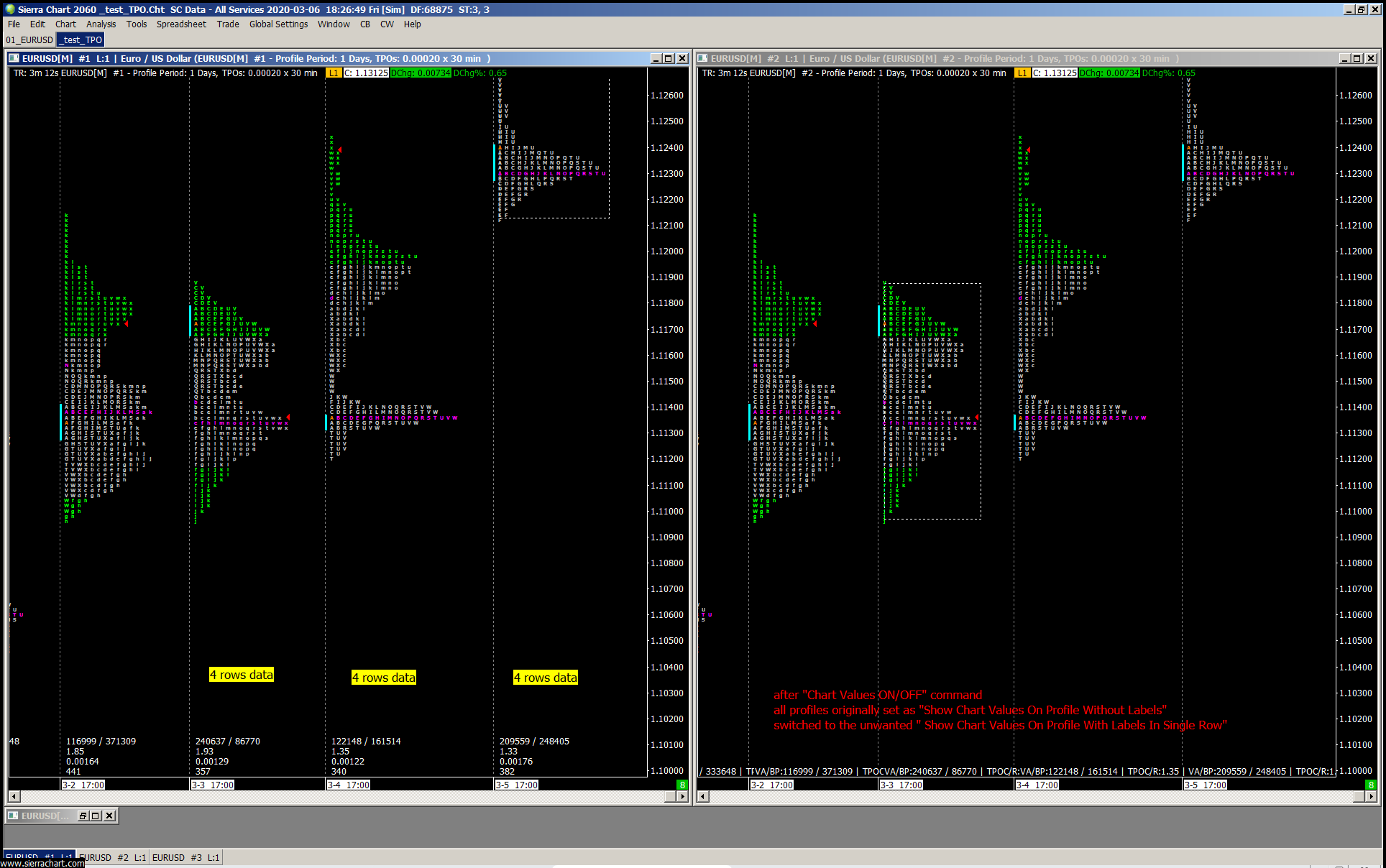 Release 2060 Thanks SC staff to add those 2 shortcut as requested. I found a little and annoying bug in the implementation of "Chart Values On/Off" command: after the right mouse click on "Chart Values ON/OFF" command all profiles originally set as "Show Chart Values On Profile Without Labels" switched to the unwanted " Show Chart Values On Profile With Labels In Single Row". Most of the time it happens after the first right-click, occasionally happens at the second right-click. Please can you check? TY Date Time Of Last Edit: 2020-03-06 17:29:58
