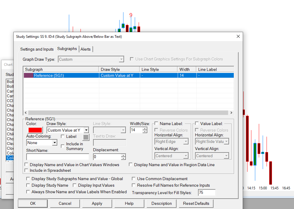 The Offset in Ticks Input is what you would want to use with Study Subgraph Above/Below Bar as Text and it definitely does work. Try using a larger value for it. But in the next release we are adding this Input: Offset in Text Heights (+/-) which will give you control of the offset based on text heights. Sierra Chart Support - Engineering Level Your definitive source for support. Other responses are from users. Try to keep your questions brief and to the point. Be aware of support policy: https://www.sierrachart.com/index.php?l=PostingInformation.php#GeneralInformation For the most reliable, advanced, and zero cost futures order routing, *change* to the Teton service: Sierra Chart Teton Futures Order Routing Date Time Of Last Edit: 2019-08-23 18:18:41