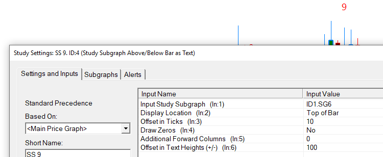 hi, I cannot get the offset in text height(+/-) to work with my charts. I am pulling a value from the spreadsheet study and using the study subgraph above/below bar as text study. attached are pics that show i am trying to offset the number "9" above the bar. i tried different tick offsets but none work. in the pic, i used offset of 100 and the "9" does not move. What am i possibly doing wrong. you mentioned before that the offset is working. update: I was just playing around with the offset in ticks(ln:3) and that was moving it away from the bars. What is the difference between offset in text heights (+/-)(ln:6) and offset in ticks (in: 3)? Thanks in advance. Date Time Of Last Edit: 2020-05-08 16:57:41