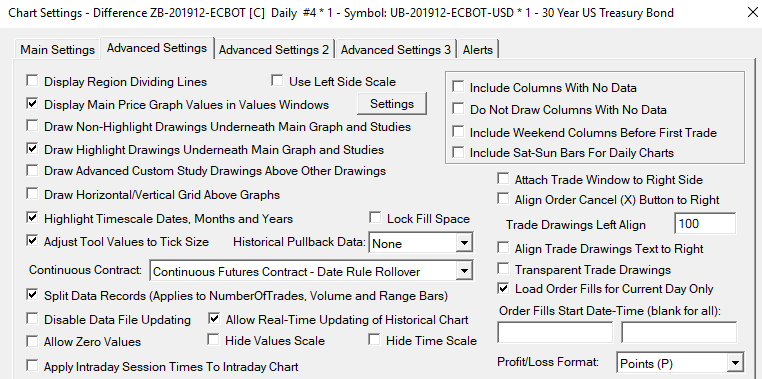 Yes that is true, that when using Add Additional Symbol study you cannot use the Continuous Futures Contract setting for that additional symbol. So you need to use another chart and use the Difference (Bar) study. For the color settings, refer to: Color Settings for Graph Draw Types Sierra Chart Support - Engineering Level Your definitive source for support. Other responses are from users. Try to keep your questions brief and to the point. Be aware of support policy: https://www.sierrachart.com/index.php?l=PostingInformation.php#GeneralInformation For the most reliable, advanced, and zero cost futures order routing, *change* to the Teton service: Sierra Chart Teton Futures Order Routing |
