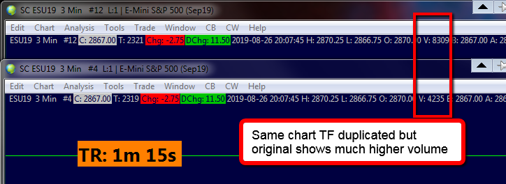 Make sure those charts are not using volume filtering: Chart Settings: Volume Filter (Chart >> Chart Settings >> Data Limiting >> Volume Filter Settings menu) Make sure the Session Times are identical for both charts: Chart Session Times And are these charts both in the same running instance of Sierra Chart? Sierra Chart Support - Engineering Level Your definitive source for support. Other responses are from users. Try to keep your questions brief and to the point. Be aware of support policy: https://www.sierrachart.com/index.php?l=PostingInformation.php#GeneralInformation For the most reliable, advanced, and zero cost futures order routing, *change* to the Teton service: Sierra Chart Teton Futures Order Routing Date Time Of Last Edit: 2019-08-27 02:01:56