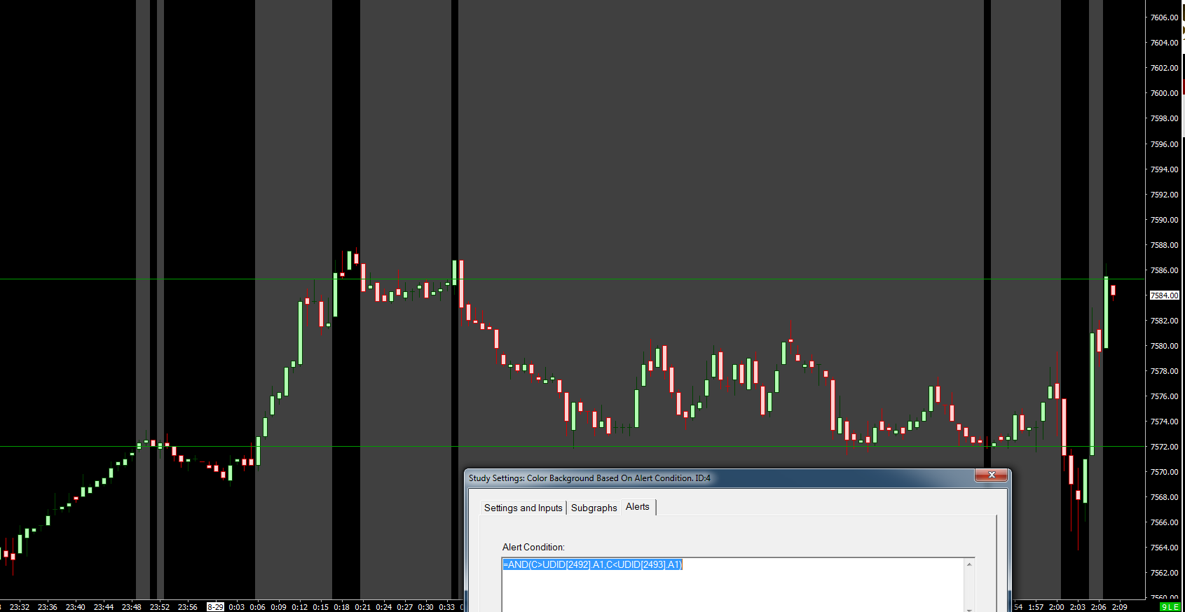 Greetings, maybe its not clear what i ment, so i try to explain: I have a problem with finding my alerts due to MANY small chart windows on MANY monitors. I study my charts myself and mark interesting price levels with horizontal lines. Because i use for my purpose several instances of SC, checking the Alert window for alerts is the WORST!!! way to find out what alert got trickered. Its too inconvinient and time consuming to do it again and again and again. The BEST!!! way to do it would be to have a changing background color once the price in a chart does reach/cross a horizontal line. It hits right the eyes. I just dont know if this is possible at all and if so how to do it. Pls give me some advice here. Thx |