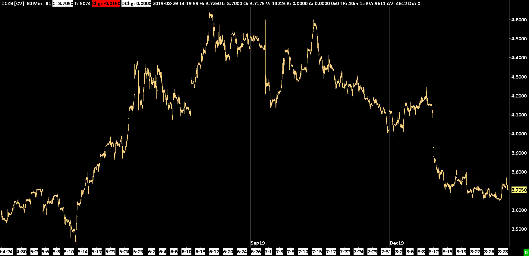 When ZCZ9 is set on intraday chart Continuous Futures Contract Volume Based Rollover no data is printed on chart prior to 22nd Aug. Changing to Date Based Rollover on the same chart prints data up to level set in Use Number of Days To Load box. Tried deleting all ZC .scid files and reloading but this did not rectify problem. Please advise. |