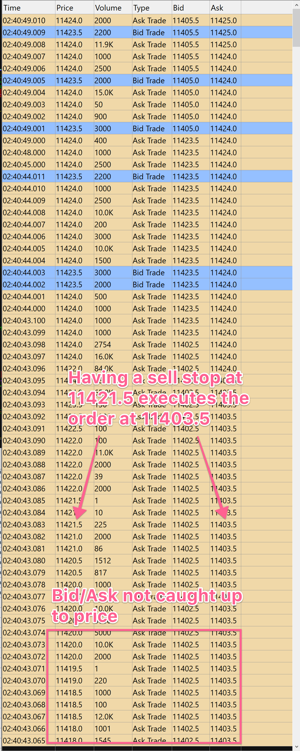 When I’m backtesting, the book is showing a specific bid-ask spread, but trades are occurring completely out of this range. This is a common occurrence, and is affecting both backtesting and execution. The trade data itself is correct, but the bid-ask spread for the book is wrong, which is why the parts of the strategies based on the bid-ask spread do not function properly. Is there anything I can try to narrow this down? Screen recording attached showing static bid-ask price while trades occurring outside the range. As well as depictive screenshot. Seems potentially related to this issue: BitMex Bid Ask trades problem Date Time Of Last Edit: 2019-08-30 20:44:27