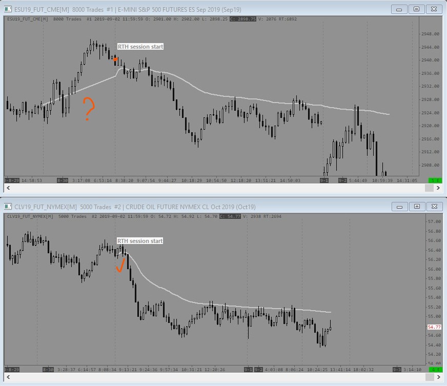 Hi support I'm having trouble with the output of the vwap line from the volume by price study when the volume graph period type is set to One Period at End of Fixed Time. Strangely the problem only seems to be present when the symbol is one of the indices - ES, MES, NQ etc. I couldn't replicate the issue on 6B, CL or GC. My intention is to have a vwap starting from the previous day rth open through to the latest bar. The screenshot attached shows ES on top with the origin coming from the evening start time rather than the rth session start. CL is shown underneath (exact same settings, chart is a copy with only the symbol changed) and the vwap line is correctly drawn from the session start time. Screen shot of the volume by price settings is also attached. I ran the ES chart on replay of last week and depending on the day the origin was jumping about all over the place. Can you please advise if I there is a setting out of place or if there is something else going on? Many thanks Date Time Of Last Edit: 2019-09-02 18:04:03