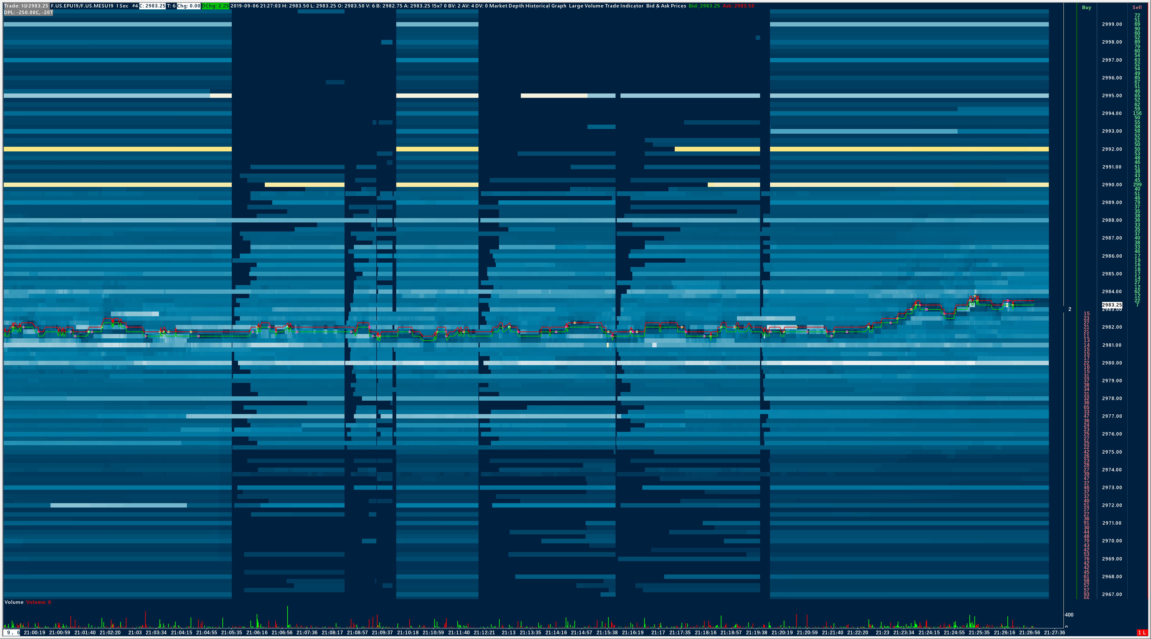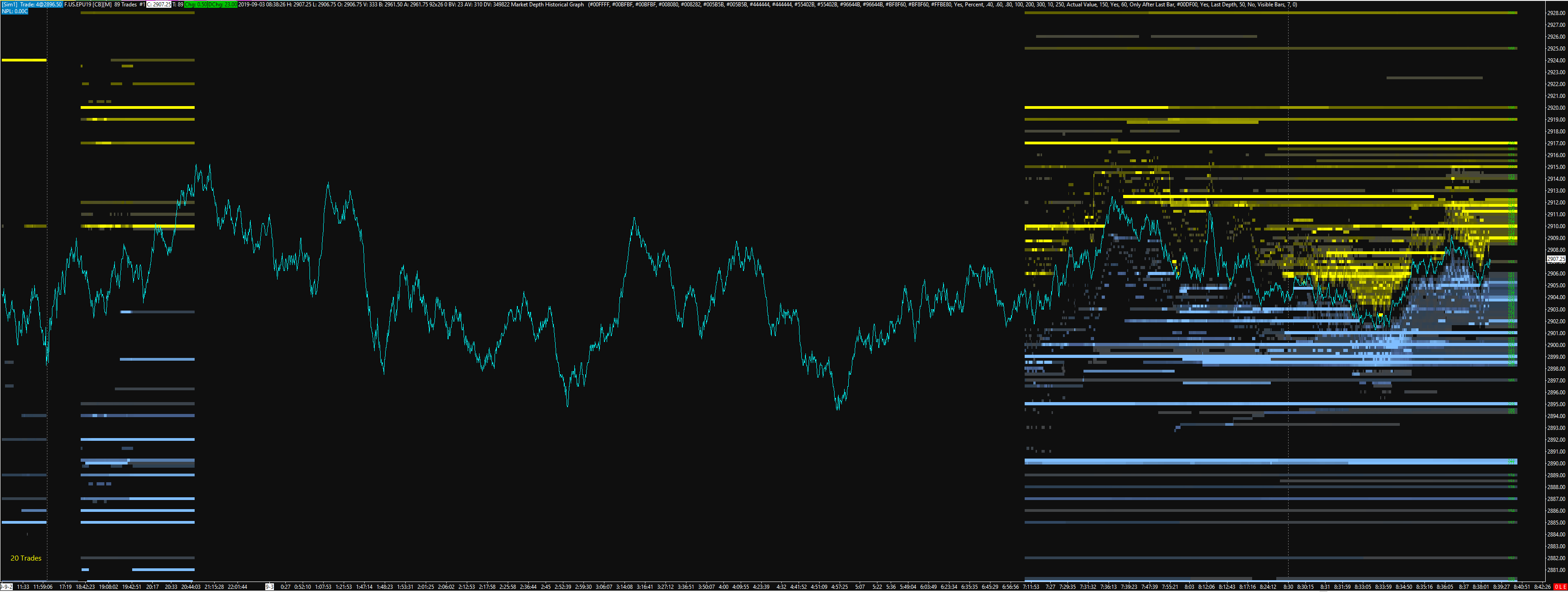When there are gaps in the Market Depth Historical Graph like that, it is because Sierra Chart was not connected to the data feed during that time, therefore the Market Depth was not recorded at that time. Some further information. There was a change to the software a few months back, where these gaps are no longer being automatically filled in by default. Prior to that point the default was to fill in those gaps with the last known depth. We see you have that you have it to fill in the gaps by having the Input for Extend Last Known Depth set to Yes, but the Input for Number of Minutes to Extend Last Known Depth is set to 60 minutes, therefore it will not fill in all the way across, it only fills in for 60 minutes. This is why you see the same coloring for the bars between approximately 19:42 and 20:42 on September 2. If you change that Input to 0, it will fill in all the way across. You will find the information for Extend Last Known Depth input here: Market Depth Historical Graph: Extend Last Known Depth Sierra Chart Support - Engineering Level Your definitive source for support. Other responses are from users. Try to keep your questions brief and to the point. Be aware of support policy: https://www.sierrachart.com/index.php?l=PostingInformation.php#GeneralInformation For the most reliable, advanced, and zero cost futures order routing, *change* to the Teton service: Sierra Chart Teton Futures Order Routing |