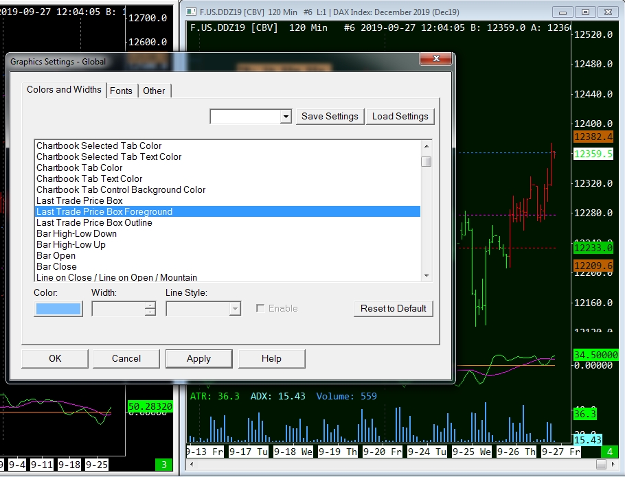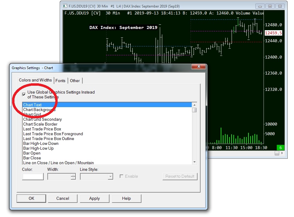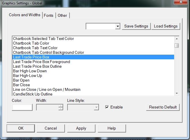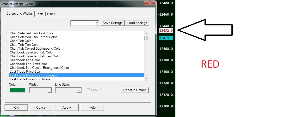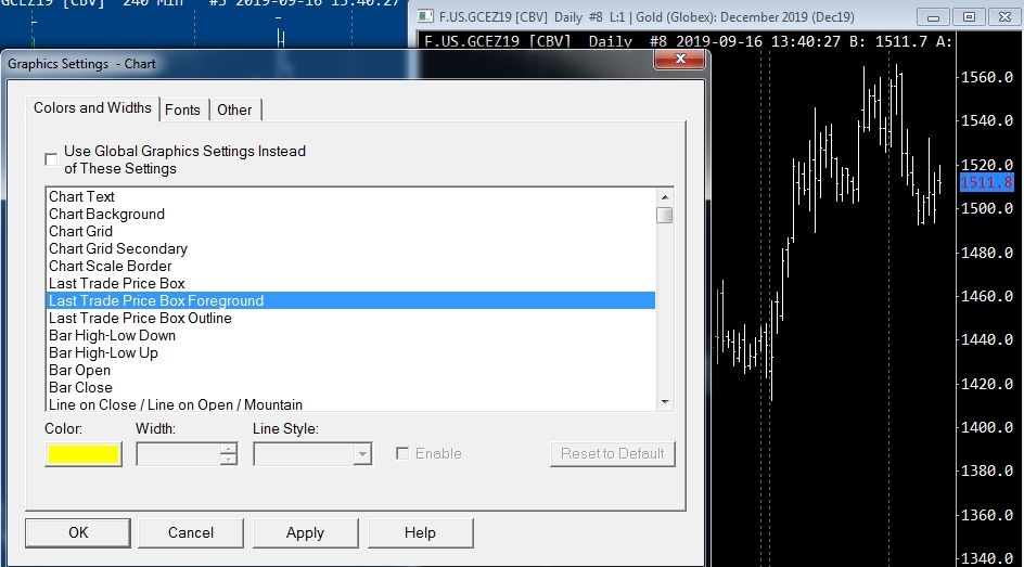Go back to the Global settings by selecting Global Settings >> Graphics Settings and change the color of the Last Trade Price Box Foreground and select OK. Let us know if the color of the text changes for any of your charts.