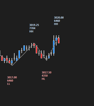 Referring to your example: The ZZ line goes above the previous HH only intrabar in the 18:44 bar. When the 18:45 bar opens and builds, the slope of the ZZ line lessens such that its value at the 18:44 bar is no longer above the previous HH. The ZZ line has a steeper slope in the 18:44 bar than it does in the 18:45 bar because it begins at the HL in the 18:41 bar and lessens its slope as it moves to newer HH bars. This same thing occurs again in the 18:45/18:46 bars. The ZZ line's higher intrabar value in the 18:44 bar is not retained, and is unavailable to be used in formulas. The only ZZ line values that are retained are values after the leg finalizes. ZZ line values of the developing leg are not retained. Since you say your actual formulas are more complex than this test example, I'm not able to offer any formula suggestions to get you the desired result. If you want a more detailed and personalized analysis, you can contact me here: https://www.sawtoothtrade.com/contact.html |