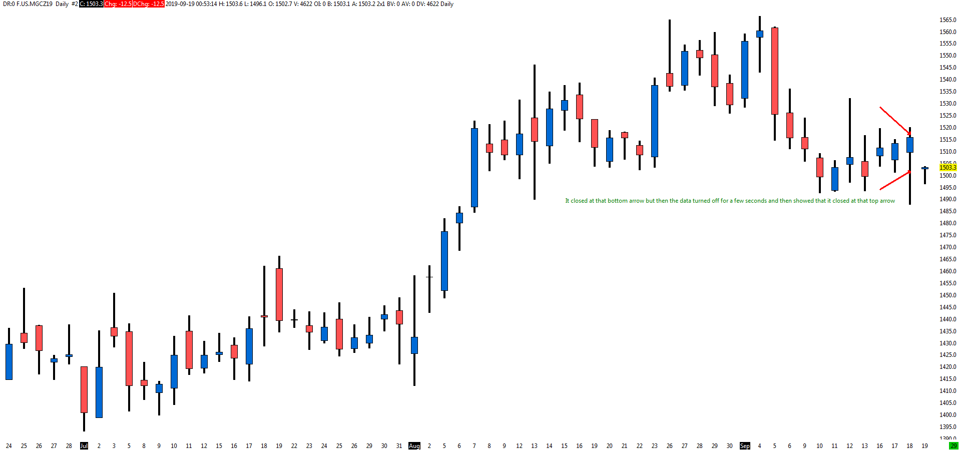 And then the new days candle showed it traded in a range it never even traded in yet. The data turned off for a few seconds and then when it came back up, it showed completely different information than what was there a few seconds prior. The closing price of the daily candle is way off from the new day's opening price. How do I fix this so it never happens again? http://www.sierrachart.com/image.php?Image=1568868799685.png |