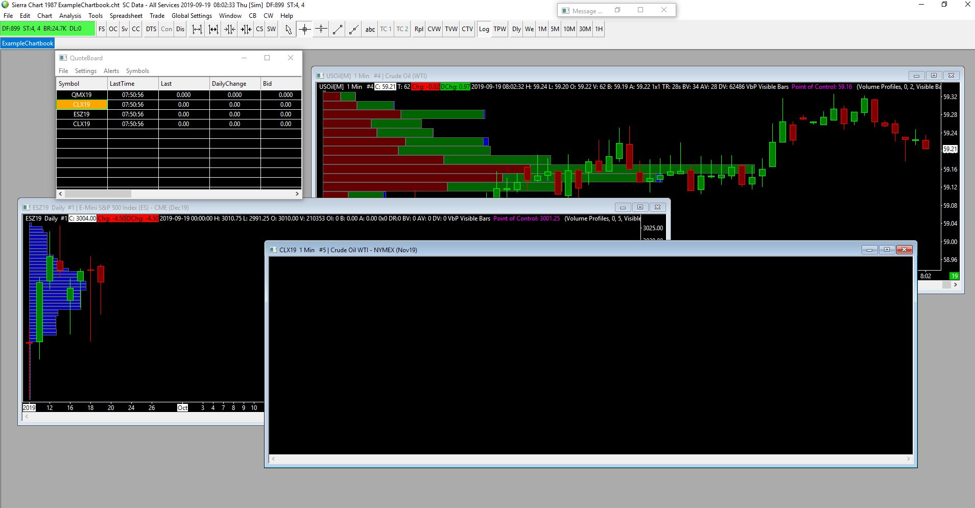 We want you to select File >> Close All Chartbooks. And then open a new Intraday chart for CLX19. Do you then see the chart? There simply should not be a problem with this at all. This is very straightforward and reliable. Sierra Chart Support - Engineering Level Your definitive source for support. Other responses are from users. Try to keep your questions brief and to the point. Be aware of support policy: https://www.sierrachart.com/index.php?l=PostingInformation.php#GeneralInformation For the most reliable, advanced, and zero cost futures order routing, *change* to the Teton service: Sierra Chart Teton Futures Order Routing |