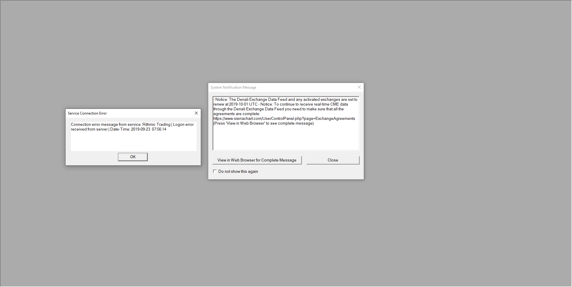 That message is not from Sierra Chart. Can you take a screenshot of it or copy and paste the exact text here. To attach a file follow these instructions: Support Board Posting Information: Attaching a File (Optional) Sierra Chart Support - Engineering Level Your definitive source for support. Other responses are from users. Try to keep your questions brief and to the point. Be aware of support policy: https://www.sierrachart.com/index.php?l=PostingInformation.php#GeneralInformation For the most reliable, advanced, and zero cost futures order routing, *change* to the Teton service: Sierra Chart Teton Futures Order Routing |