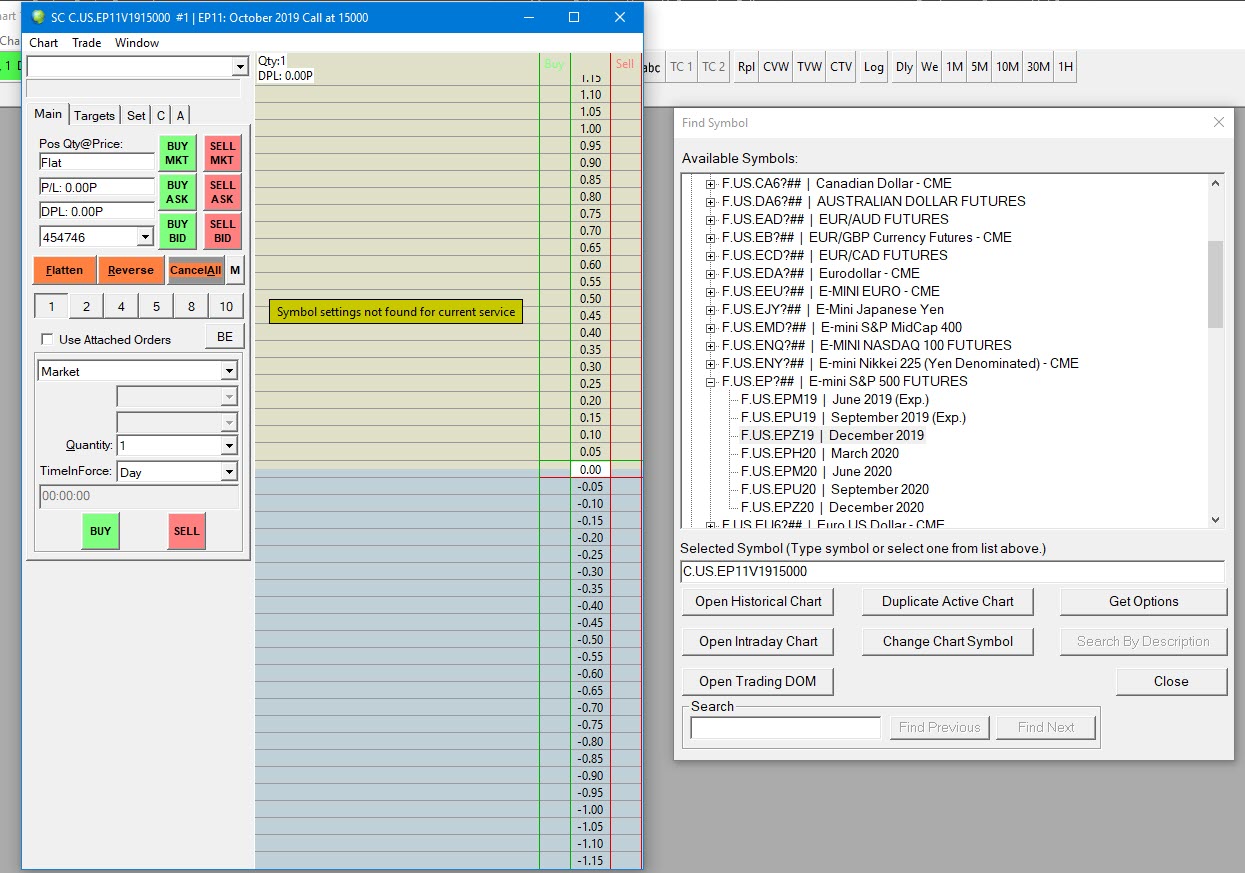 It is completely safe to ignore that error message about symbol settings not being found. It will occur for option symbols when using CQG because there are no pattern matching symbols set up for them. But that is not needed. What is one of the options symbols you are looking at and we will see if we can set up a pattern for it . Also this service supports options as well: Sierra Chart / Trading Technologies Futures Order Routing Service And it supports getting automatic listings of option symbols as well for particular futures contracts. Sierra Chart Support - Engineering Level Your definitive source for support. Other responses are from users. Try to keep your questions brief and to the point. Be aware of support policy: https://www.sierrachart.com/index.php?l=PostingInformation.php#GeneralInformation For the most reliable, advanced, and zero cost futures order routing, *change* to the Teton service: Sierra Chart Teton Futures Order Routing |